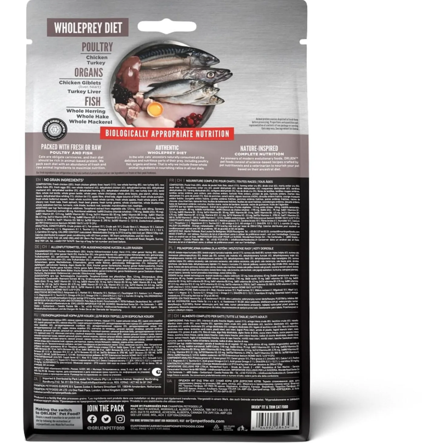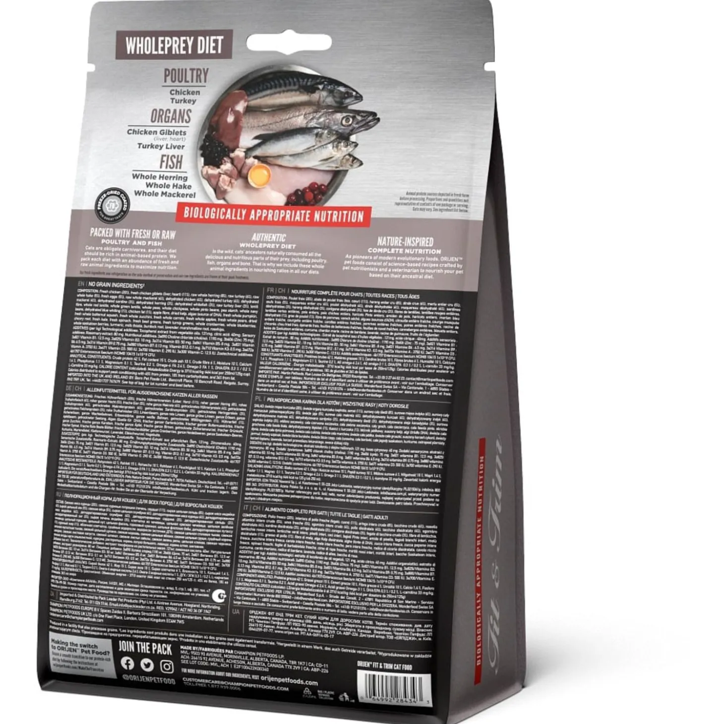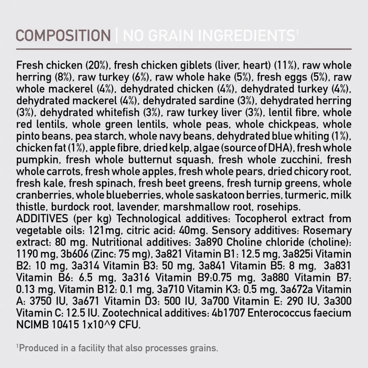 | Samenstelling | Vers kippenvlees (16%), Vers kalkoenvlees (7%), Verse hele eieren (6%), Verse kippenlevertjes(6%), Verse hele haring (6%), Verse Pacifische Pijltandheilbot (5%), Verse hele Pacifischehorsmakreel (5%), Verse kalkoen lever (4%), Verse hele Pacifische heek (4%), Verse kippenhartjes (4%), Verse kalkoen hartjes (4%), Kippenvlees (gedroogd, 4%), Kalkoenvlees (gedroogd,4%), Hele makreel (gedroogd, 4%), Hele sardine (gedroogd, 4%), Hele Haring (gedroogd, 4%),Hele Atlantische makreel (gedroogd, 4%), Linzen vezel, Hele rode linzen, Appelvezel, Helegroene linzen, Hele groene erwten, Hele kikkererwten, Hele gele erwten, Zon gedroogdealfalfa, Hele Kievitsbonen, Hele witte bonen, Kippen kraakbeen (gedroogd, 1%), Versekalkoen hart (1%), Blauwe wijting (gedroogd, 1%), Kippen vet (0,5%), gedroogde algen(natuurlijke bron van DHA en EPA), Pompoen (gedroogd), Muskuspompoen (gedroogd),Wortelen (gedroogd), Gedroogde bruine zeewier, Kippenlevertjes (gevriesdroogd),Kalkoenlever (gevriesdroogd), Verse pompoen, Verse butternut squash, Courgette,Pastinaak, Verse hele wortelen, Verse Red Delicious appels, Verse Bartlett peren,Verse cranberries, Verse bosbessen, Saskatoon bessen, Verse groene boerenkool,Verse spinazie, Rode bieten loof, Raapstelen, Cichoreiwortel, Kurkuma,Mariadistel, Kliswortel, Lavendel, Heemstwortel, Rozenbottels. |
