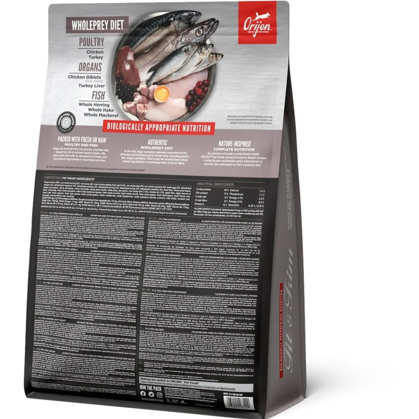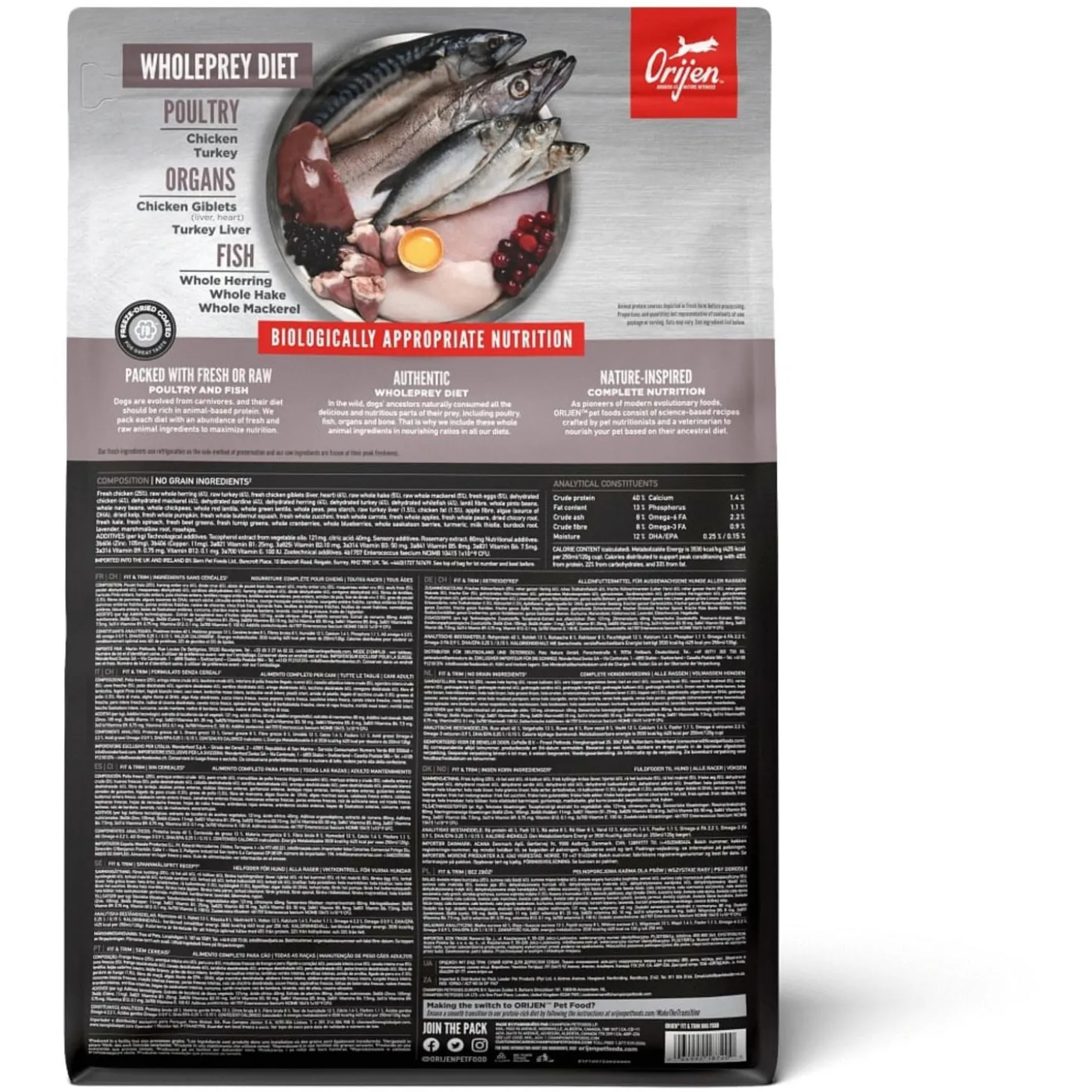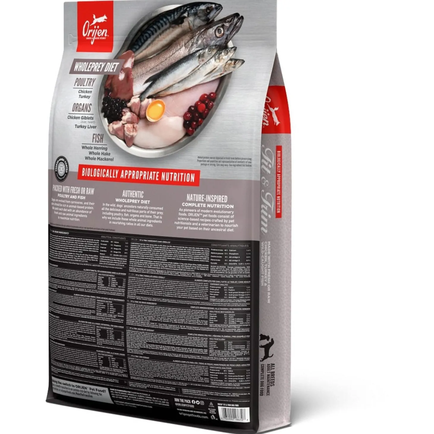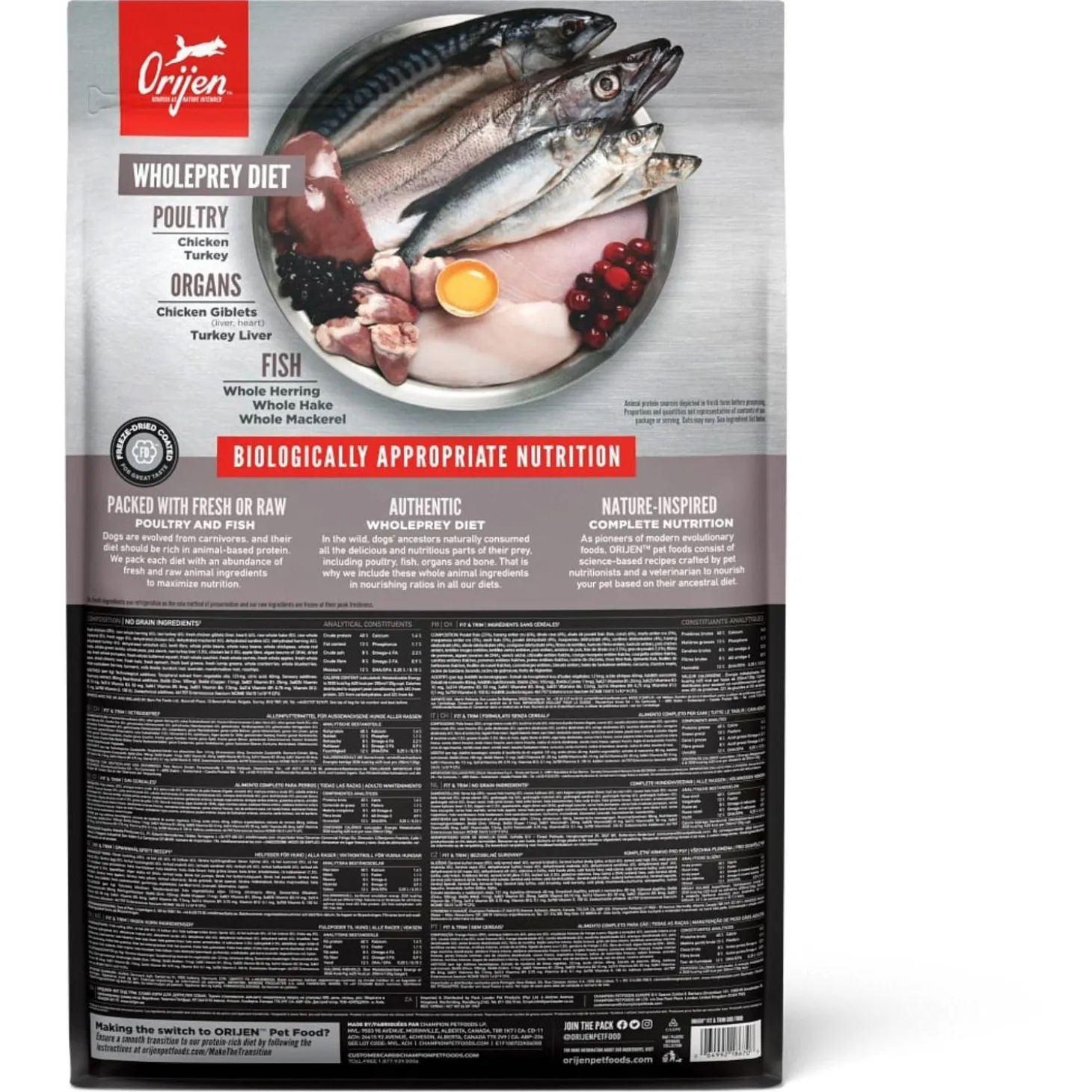 | Samenstelling | Vers kippenvlees (16%), Verse hele eieren (6%), Verse hele haring(6%), Vers kalkoenvlees (6%),Verse kippenlevertjes (6%), Verse Pacifische Pijltandheilbot (4%), Verse hele Pacifischehorsmakreel (4%), Verse hele Pacifische heek (4%), Verse verse kalkoen lever (4%), Verse versekippen hartjes (4%), Verse kalkoen hartjes (4%), Kippenvlees (gedroogd, 4%), Kalkoenvlees(gedroogd, 4%), Hele makreel (gedroogd, 4%), Hele sardine (gedroogd, 4%), Hele Haring(gedroogd, 4%), Hele koolvis (gedroogd, 4%), Linzen vezel, Hele rode linzen, Hele groenelinzen, Hele groene erwten, Hele kikkererwten, Hele gele erwten, Hele Kievitsbonen, Helewitte bonen, Kippen kraakbeen (gedroogd, 1%), Verse kalkoenhartjes (1%), Appel vezel,Gedroogde algen (natuurlijke bron van DHA en EPA), Pompoen (gedroogd), Butternutsquash (gedroogd), Wortelen (gedroogd), Kippenlevertjes (gevriesdroogd), Kalkoenlever(gevriesdroogd), Verse pompoen, Verse muskuspompoen, Courgette, Pastinaak, Versewortelen, Verse Red Delicious appels, Verse Bartlett peren, Verse cranberries, Versebosbessen, Saskatoon bessen, Verse groene boerenkool, Verse spinazie, Rode bietenloof, Raapstelen, Gedroogde bruine zeewier, Cichoreiwortel, Kurkuma, Mariadistel,Kliswortel, Lavendel, Heemstwortel, Rozenbottels. |
