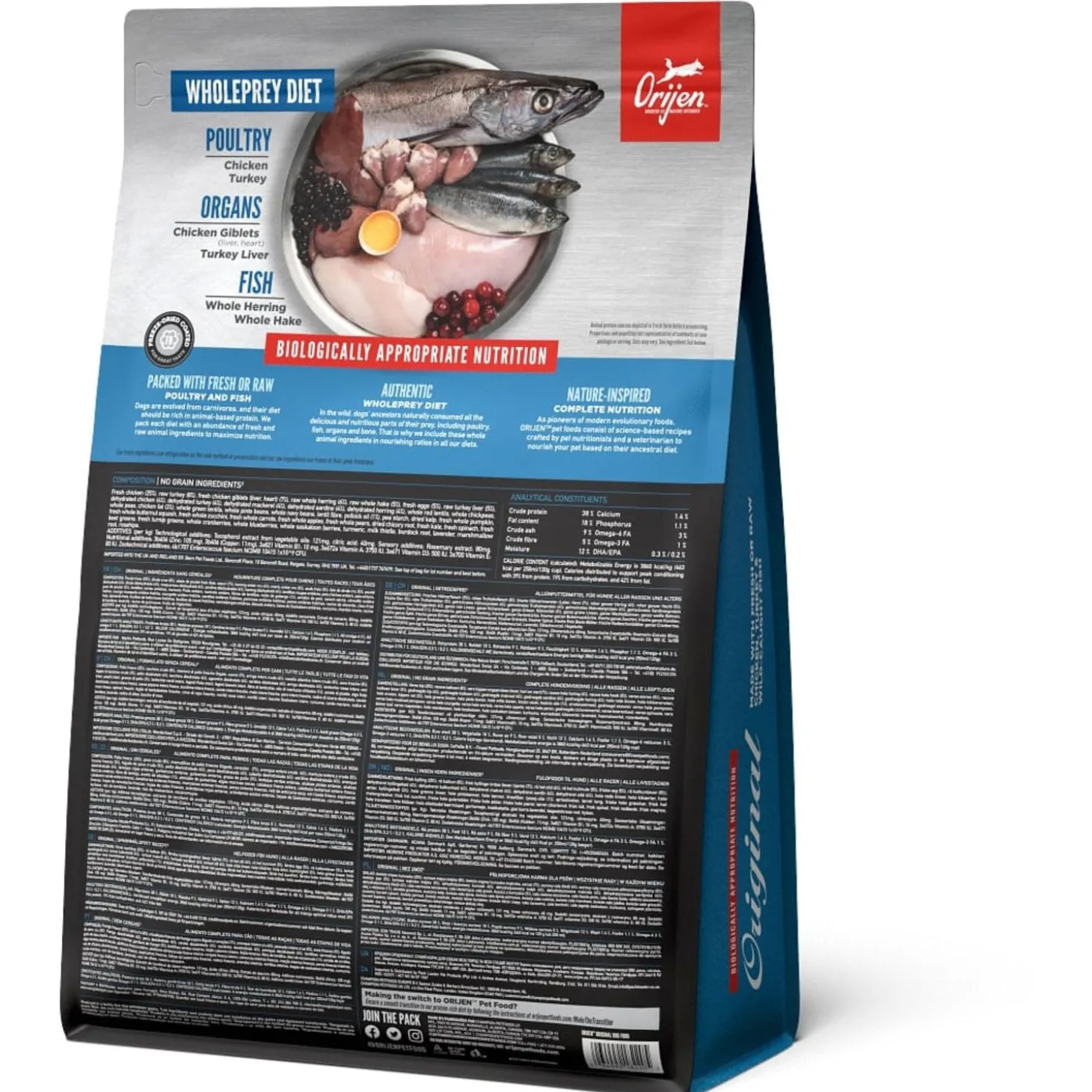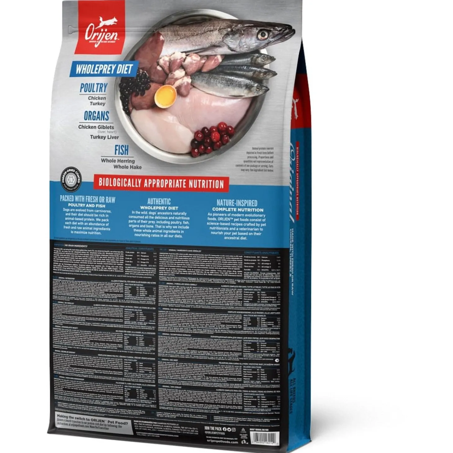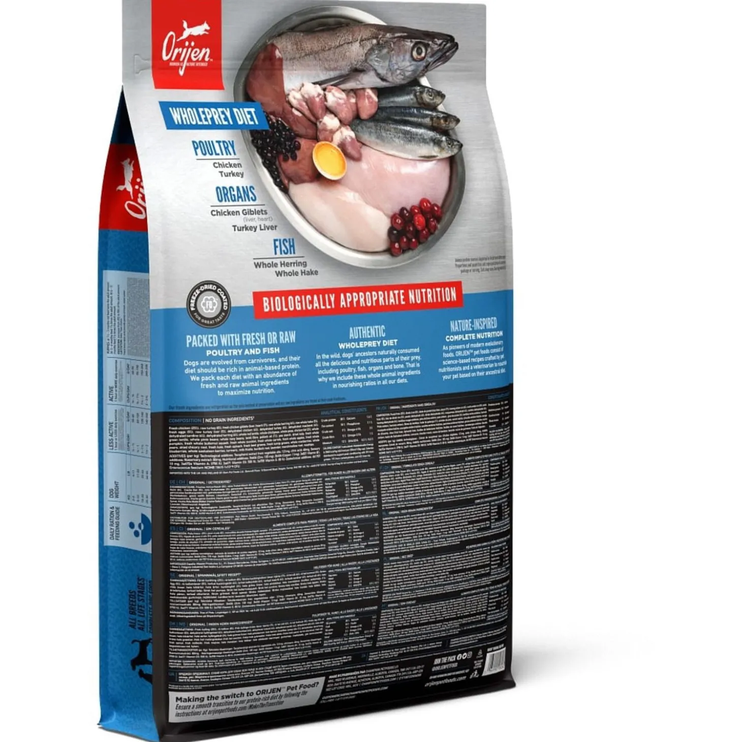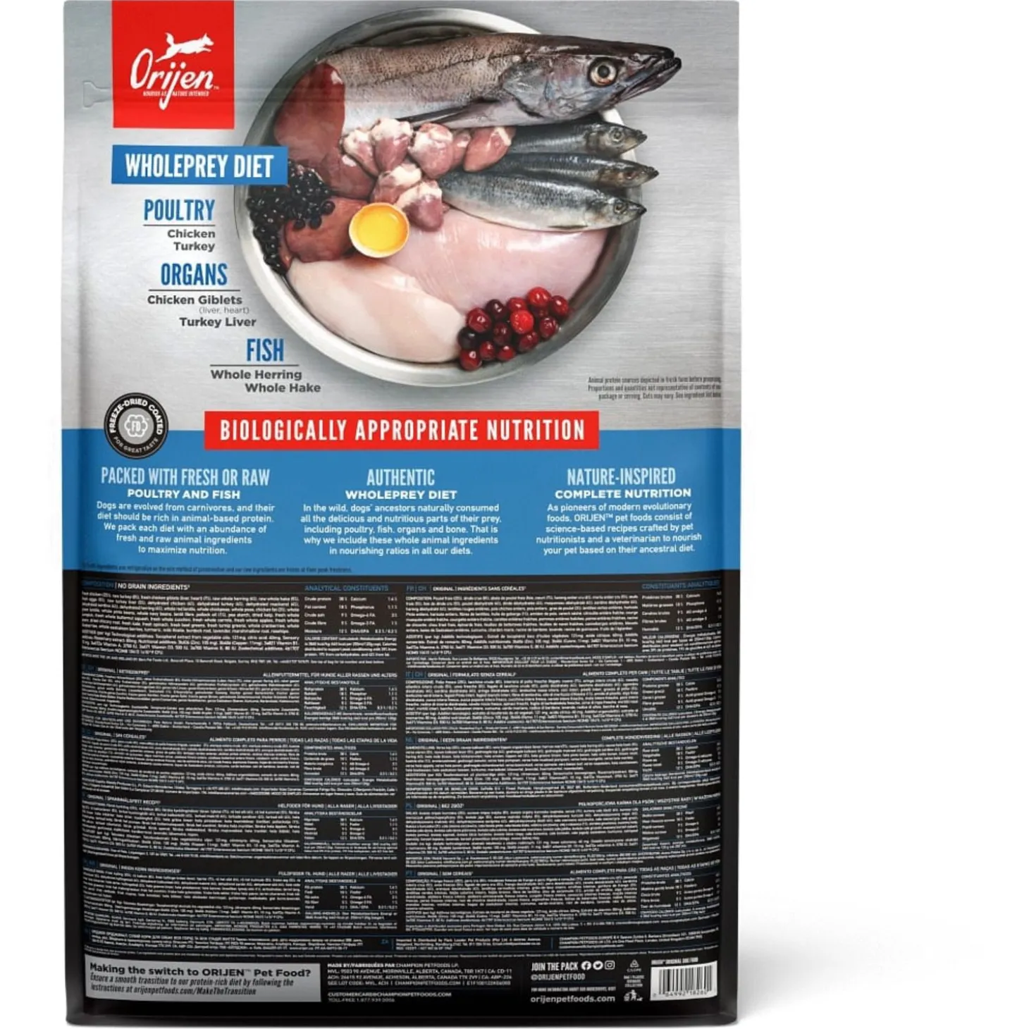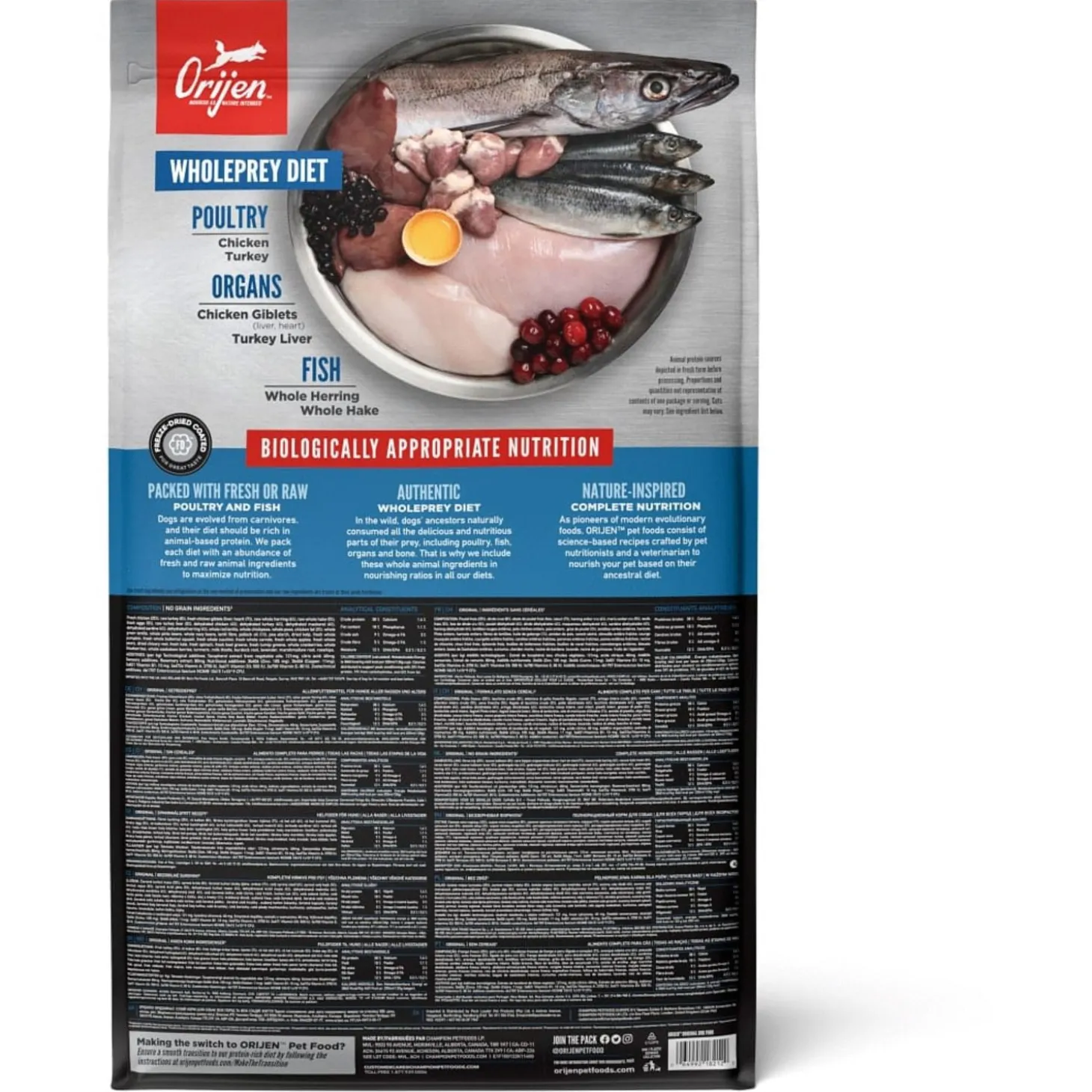 | Samenstelling | Vers kippenvlees (13%), Vers kalkoenvlees (7%), Verse hele eieren (7%), Versekippenlevertjes (6%), Verse hele haring (6%), Verse Pacifische Pijltandheilbot (5%),Verse kalkoenlever (5%), Verse kippenniertjes (4%), Verse kippenhartjes (4%), Versekalkoenhartjes (4%), Kippenvlees (gedroogd, 4%), Kalkoenvlees (gedroogd, 4%),Hele makreel (gedroogd, 4%), Hele sardine (gedroogd, 4%), Hele Haring (gedroogd, 4%),Hele rode linzen, Hele groene groenen linzen, Hele groene erwten, Linzen vezel,Hele kikkererwten, Hele gele erwten, Hele Kievitsbonen, Hele witte bonen,Haring olie (1%), Kippen vet (1%), Kippen kraakbeen (1%), Kippenlevertjes(gevriesdroogd), Kalkoenlever (gevriesdroogd), Verse pompoen, Versemuskuspompoen, Courgette, Pastinaak, Verse wortelen, Verse Red Deliciousappels, Verse Bartlett peren, Verse cranberries, Verse bosbessen, Saskatoonbessen, Verse groene boerenkool, Verse spinazie, Rode bieten loof, Raapstelen,Gedroogde bruine zeewier, Cichoreiwortel, Kurkuma, Mariadistel, Kliswortel,Lavendel, Heemstwortel, Rozenbottels. |
