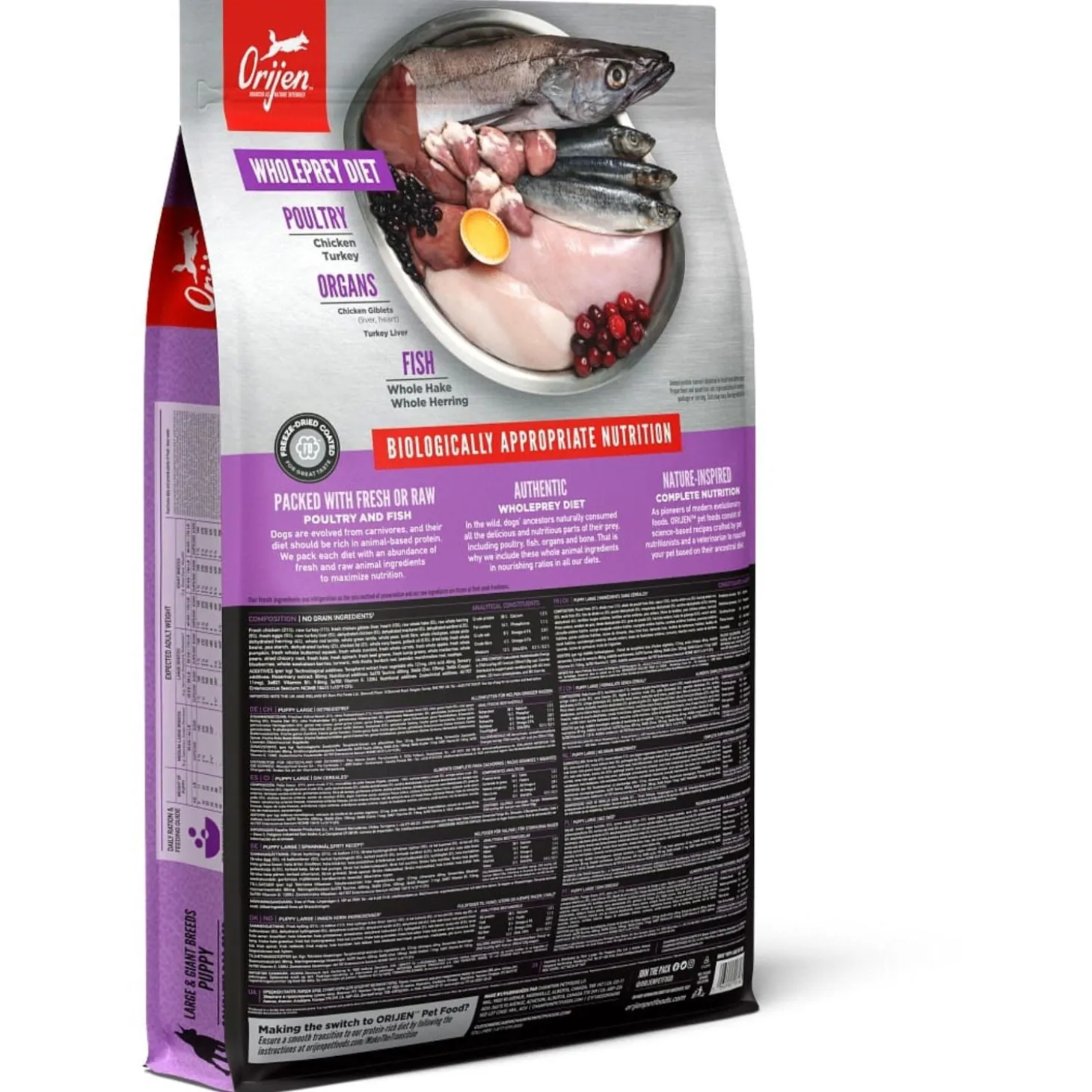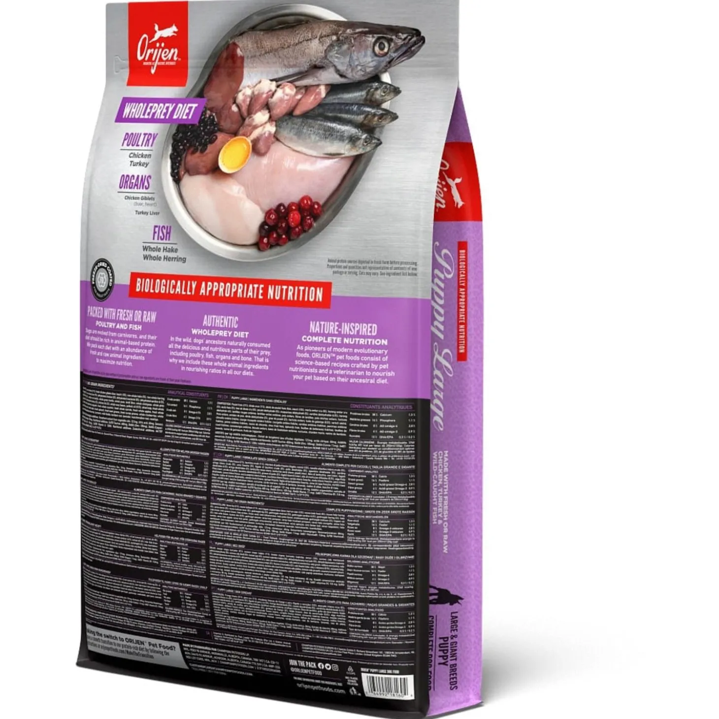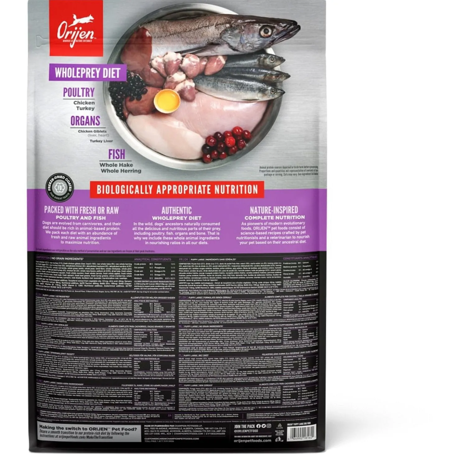 | Samenstelling | Vers kippenvlees (14%), Vers kalkoenvlees (7%), Verse hele eieren (7%), Versekippenlevertjes (6%), Verse hele haring (5%), Verse Pacifische Pijltandheilbot (5%),Verse kalkoenlever (4%), Verse kippen niertjes (4%), Verse kippenhartjes (4%), Versekalkoenhartjes (4%), Kippenvlees (gedroogd, 4%), Kalkoenvlees (gedroogd, 4%),Hele makreel (gedroogd, 4%), Hele sardine (gedroogd, 4%), Hele Haring(gedroogd, 4%), Hele rode linzen, Hele groene linzen, Hele groene erwten,Linzen vezel, Hele kikkererwten, Hele gele erwten, hele Kievitsbonen, Helewitte bonen, Haring olie (1%), Kippen kraakbeen (1%), Kippen vet (1%), Zongedroogde alfalfa, Kippenlevertjes (gevriesdroogd), Kalkoen lever (gevriesdroogd),Verse pompoen, Verse muskuspompoen, Courgette, Pastinaak, Verse wortelen,Verse Red Delicious appels, Verse Bartlett peren, Verse cranberries, Versebosbessen, Saskatoon bessen, Verse groene boerenkool, Verse spinazie,Rode bieten loof, Raapstelen, Gedroogde bruine zeewier, Cichoreiwortel,Kurkuma, Mariadistel, Kliswortel, Lavendel, Heemstwortel, Rozenbottels. |