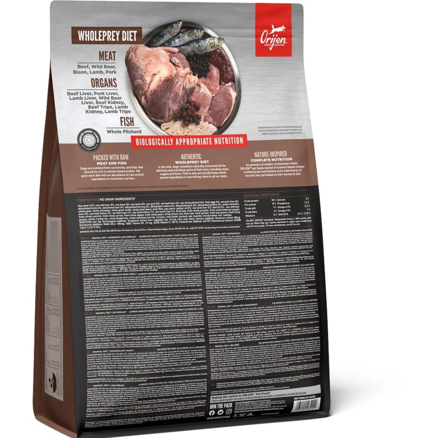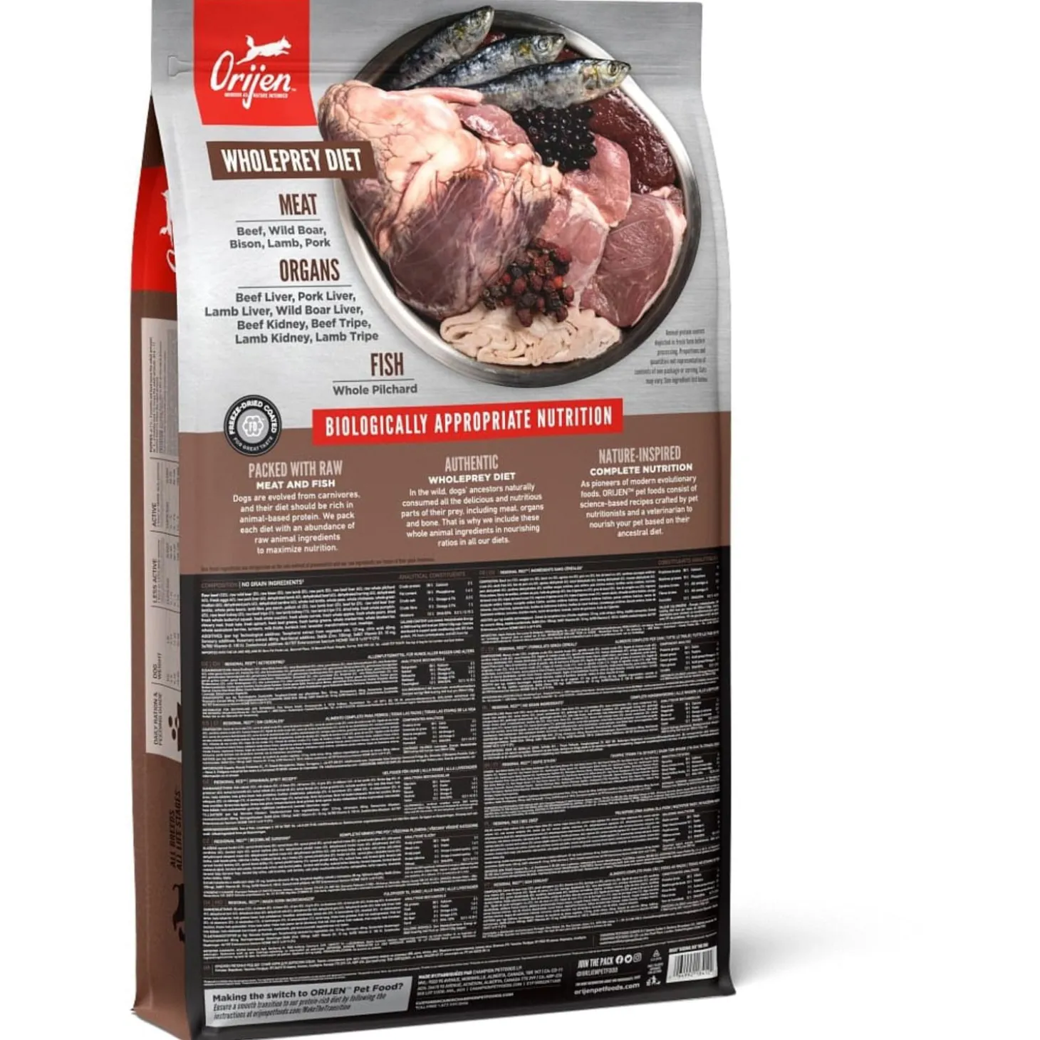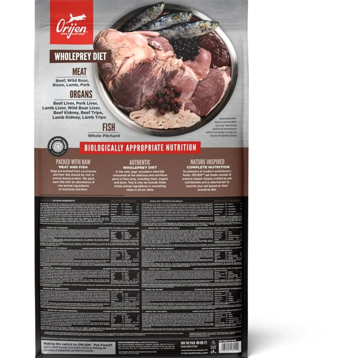 | Samenstelling | Vers Angus rundvlees (9%), Vers wild zwijnen vlees (4%), Verse Europese bizon vlees (4%),Vers of rauw lamsvlees (4%), Vers Yorkshire varken (4%), Verse runderlever (4%), Verserunder pens (4%), Verse hele sardine (4%), Verse hele eieren (4%), Verse wild zwijnenlever (4%), Lamsvlees (gedroogd, 4%), Rundvlees (gedroogd, 4%), Hele Haring (gedroogd,4%), Schapenvlees (gedroogd, 4%), Varkensvlees (gedroogd, 4%), Verse lamslever (3,5%),Verse lamspens (3,5%), Hele sardine (gevriesdroogd, 3%), Verse varkenslever (3%), Helerode linzen, Hele groene linzen, Hele groene erwten, Linzen vezel, Hele kikkererwten,Hele gele erwten, Hele Kievitsbonen, runder vet (1%), varkens vet (1%), Haring olie (1%),Runderkraakbeen (gedroogd, 1%), Runderlever (Gevriesdroogde), Runderpens(gevriesdroogd), Lamslever (gevriesdroogd), Lamspens (gevriesdroogd), Versepompoen, Verse muskuspompoen, Courgette, Pastinaak, Verse wortelen, VerseRed Delicious appels, Verse Bartlett peren, Verse cranberries, Verse bosbessen,Verse groene boerenkool, Verse spinazie, Rode bieten loof, Raapstelen,Gedroogde bruine zeewier, Cichoreiwortel, Kurkuma, Mariadistel, Kliswortel,Lavendel, Heemstwortel, Rozenbottels. |