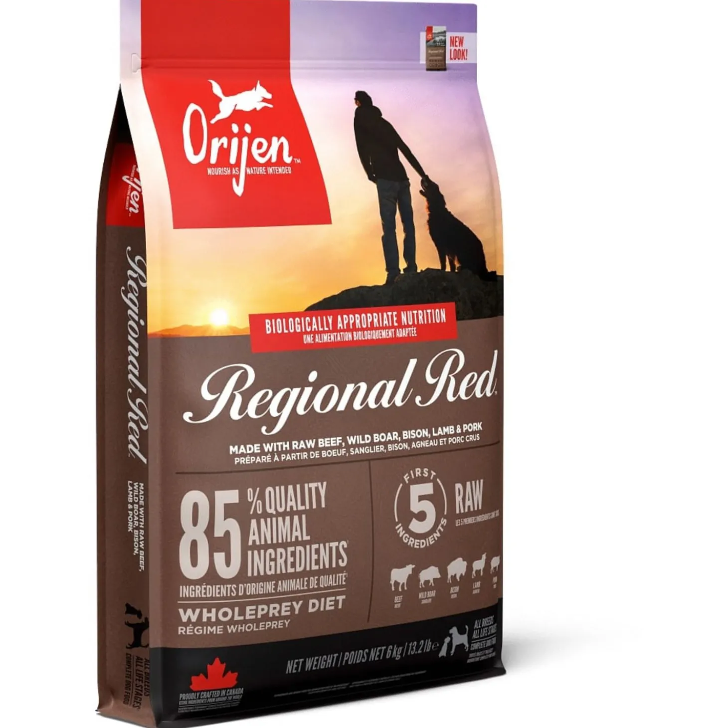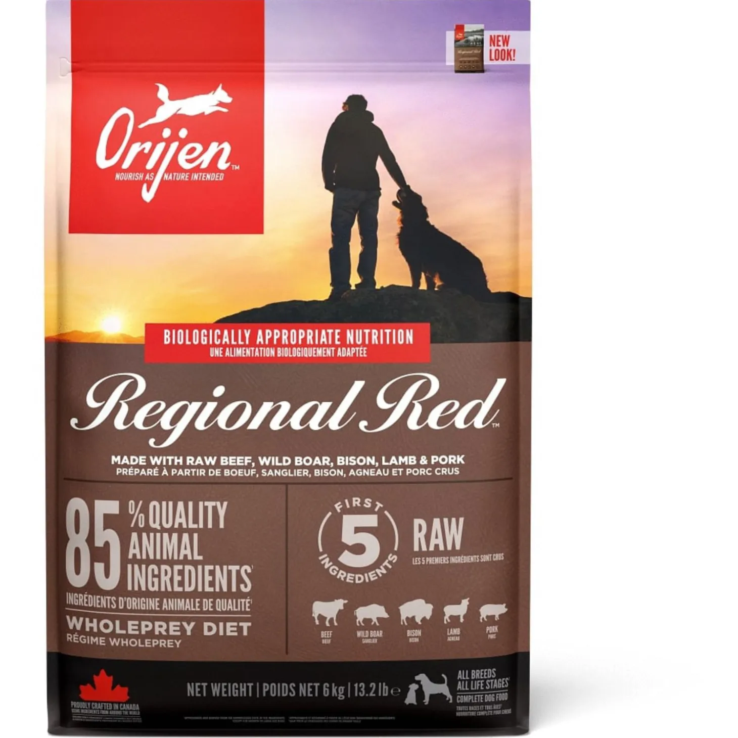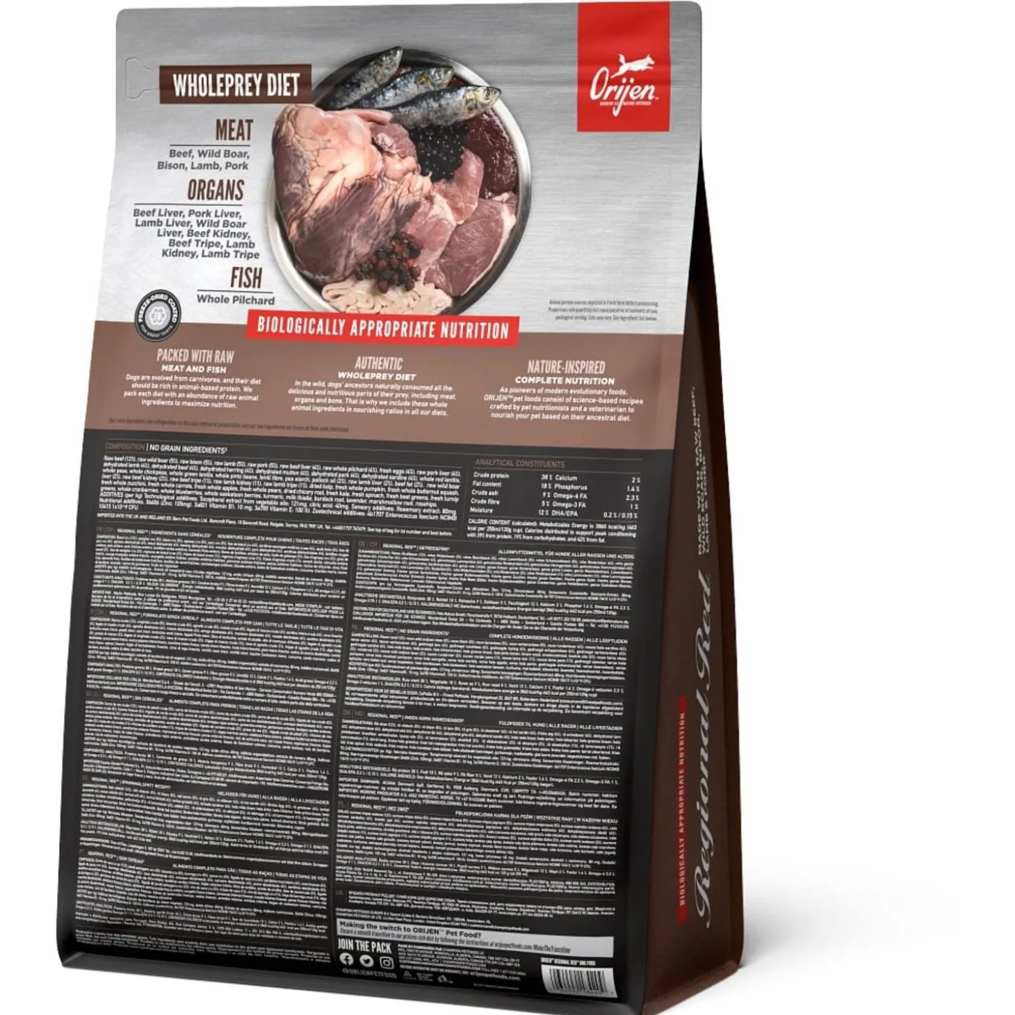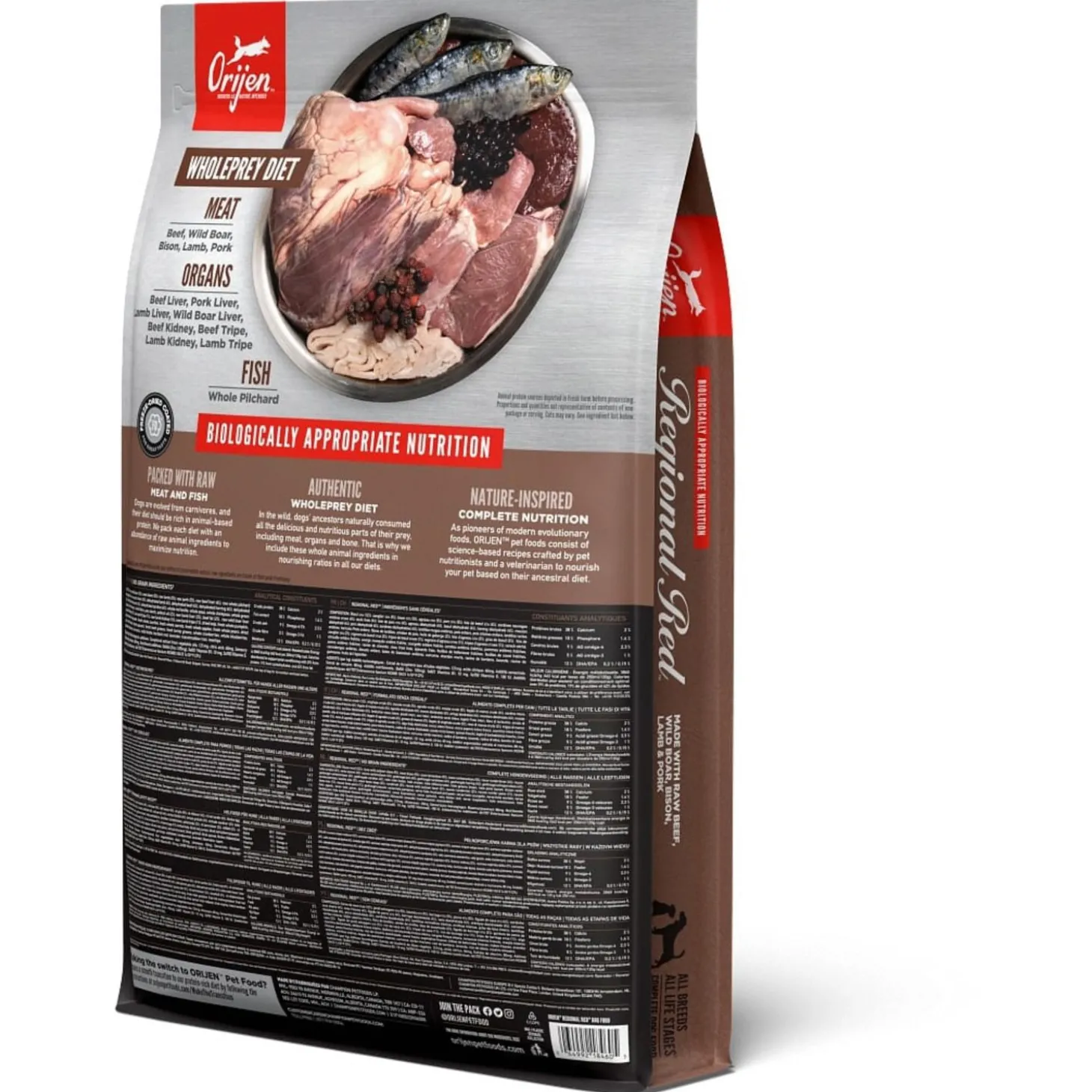 | Samenstelling | Vers Angus rundvlees (9%), Vers wild zwijnen vlees (4%), Verse Europese bizon vlees (4%),Vers of rauw lamsvlees (4%), Vers Yorkshire varken (4%), Verse runderlever (4%), Verserunder pens (4%), Verse hele sardine (4%), Verse hele eieren (4%), Verse wild zwijnenlever (4%), Lamsvlees (gedroogd, 4%), Rundvlees (gedroogd, 4%), Hele Haring (gedroogd,4%), Schapenvlees (gedroogd, 4%), Varkensvlees (gedroogd, 4%), Verse lamslever (3,5%),Verse lamspens (3,5%), Hele sardine (gevriesdroogd, 3%), Verse varkenslever (3%), Helerode linzen, Hele groene linzen, Hele groene erwten, Linzen vezel, Hele kikkererwten,Hele gele erwten, Hele Kievitsbonen, runder vet (1%), varkens vet (1%), Haring olie (1%),Runderkraakbeen (gedroogd, 1%), Runderlever (Gevriesdroogde), Runderpens(gevriesdroogd), Lamslever (gevriesdroogd), Lamspens (gevriesdroogd), Versepompoen, Verse muskuspompoen, Courgette, Pastinaak, Verse wortelen, VerseRed Delicious appels, Verse Bartlett peren, Verse cranberries, Verse bosbessen,Verse groene boerenkool, Verse spinazie, Rode bieten loof, Raapstelen,Gedroogde bruine zeewier, Cichoreiwortel, Kurkuma, Mariadistel, Kliswortel,Lavendel, Heemstwortel, Rozenbottels. |