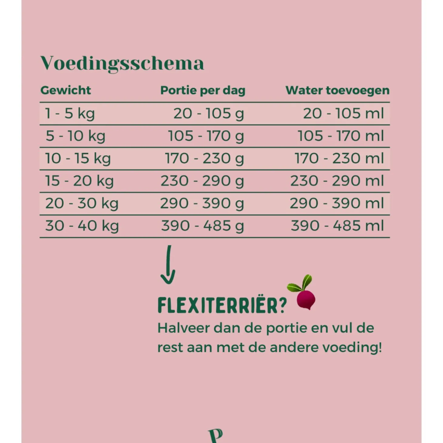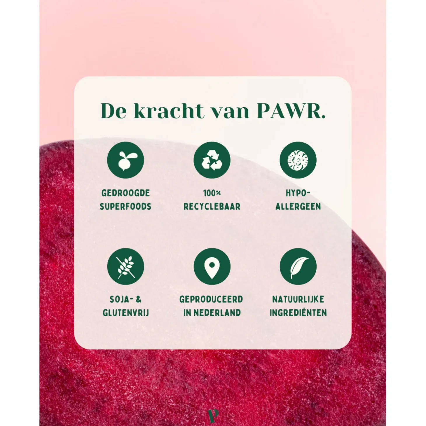 Beet Booster wordt geproduceerd in Nederland en verpakt in een 100% recyclebare verpakking. De voeding is uiteraard goed uitgebalanceerd zodat je hond niks tekort komt. Het voer zit boordevol natuurlijke ingrediënten van de beste kwaliteit. Daarnaast bevat het voer juist geen soja, gluten of geur-, kleur- en smaakstoffen. Door kilo’s vlees in te wisselen voor de kracht van planten kiest PAWR voor een betere gezondheid van je viervoeter, onze planeet en alle dieren die erop leven!