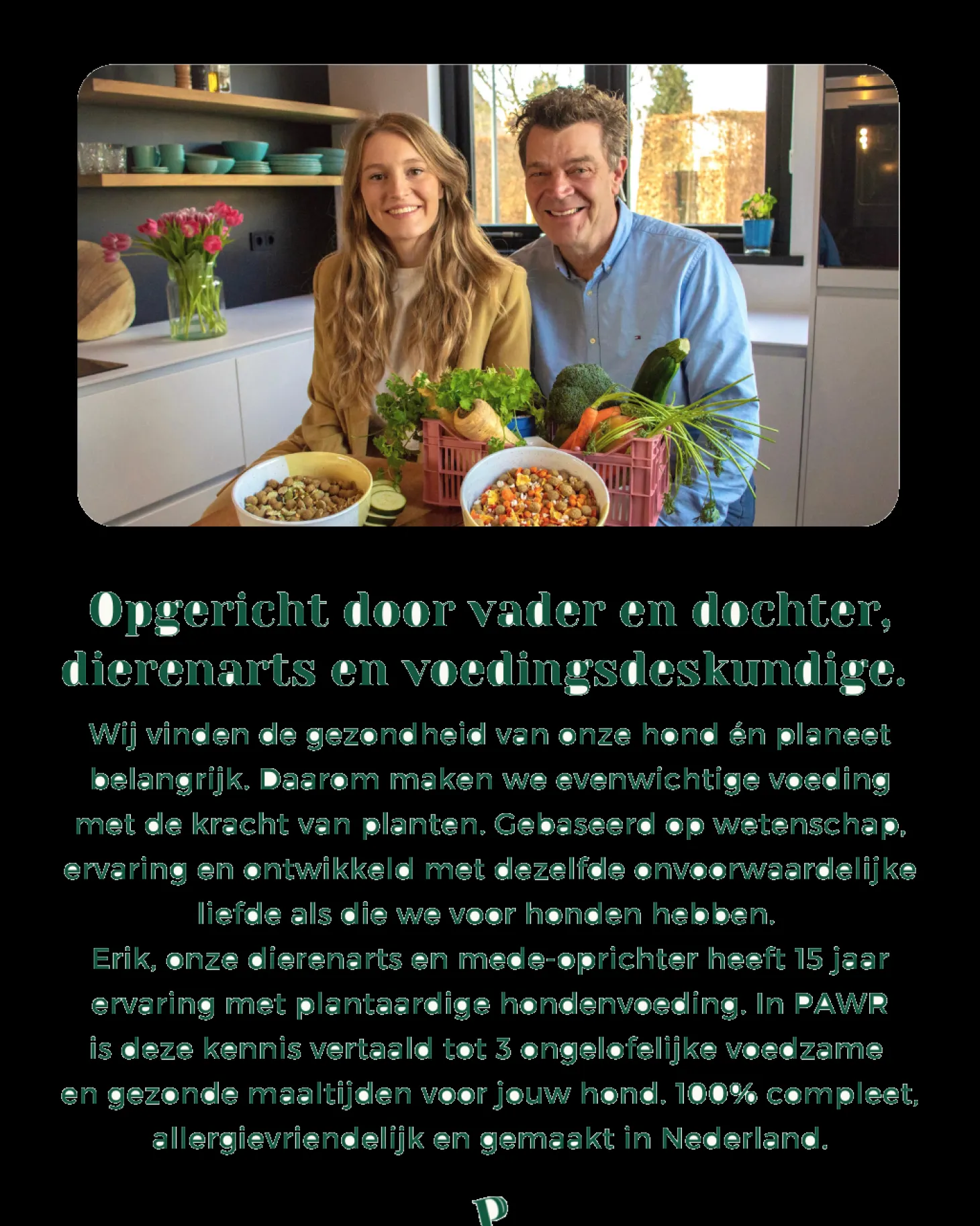 De voedingen van PAWR zijn 100% plantaardig, goed voor je hond én de planeet! Het eerste complete plantaardige hondenvoeding bedrijf van Nederland opgericht door voedingsdeskundige en dierenarts. De superfoods zoals groenten, zaden en peulvruchten zitten boordevol gezonde voedingsstoffen; denk aan vitaminen mineralen en vezels. Door je hond over te zetten op PAWR blijven ook nog eens veel dieren zoals kippen, varkens en koeien bespaard.