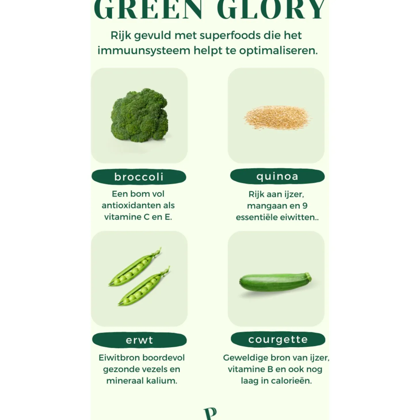 Het voer zit boordevol superfoods waardoor de gezondheid van je viervoeter een echte boost krijgt. Door wat warm water toe te voegen, maak je het voer helemaal af en zal je hond smikkelen van een gezonde en lekkere maaltijd. In Green Glory zitten verschillende superfoods: