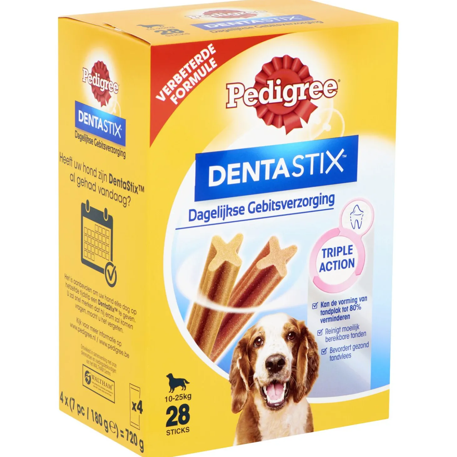 Pedigree DentaStix heeft een unieke x-vorm die om de tanden van de hond heen valt en deze zo reinigt. Wanneer dit dagelijks gevoerd wordt, kan het de opbouw van tandsteen tot wel 80% verminderen.