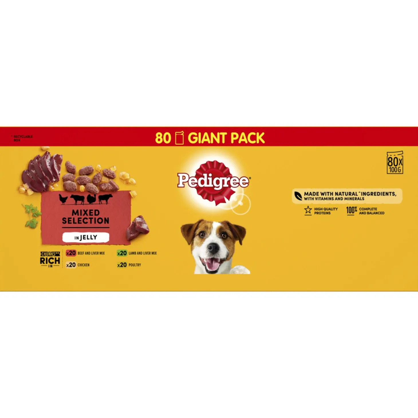 De PEDIGREE® Voordeelverpakking Adult Mix Selectie bevat natvoeding in gelei: een volwaardige maaltijd voor volwassen honden, voorzien van gezonde voedingsstoffen en alles wat honden nodig hebben. Deze multipack bevat 80 maaltijdzakjes in 4 smaakvarianten: kip, gevogelte, rund en lam met levermix.