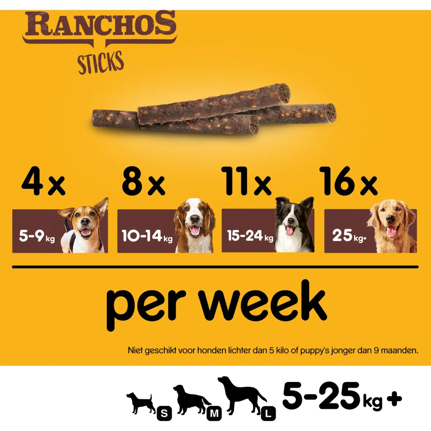 | Aanbeveling | Voedingsadvies: Kleine honden (5-9 kg), geef tot 4 stuks per week. Middelgrote honden (10-14 kg), geef tot 8 stuks per week. Middelgrote tot grote honden (15-24 kg), geef tot 11 stuks per week. Grote honden (25 kg en zwaarder), geef tot 16 stuks per week. Niet geschikt voor honden onder 5 kg of puppy’s onder 9 maanden. Pas de hoofdmaaltijd overeenkomstig aan. Zorg dat er altijd vers drinkwater beschikbaar is. |