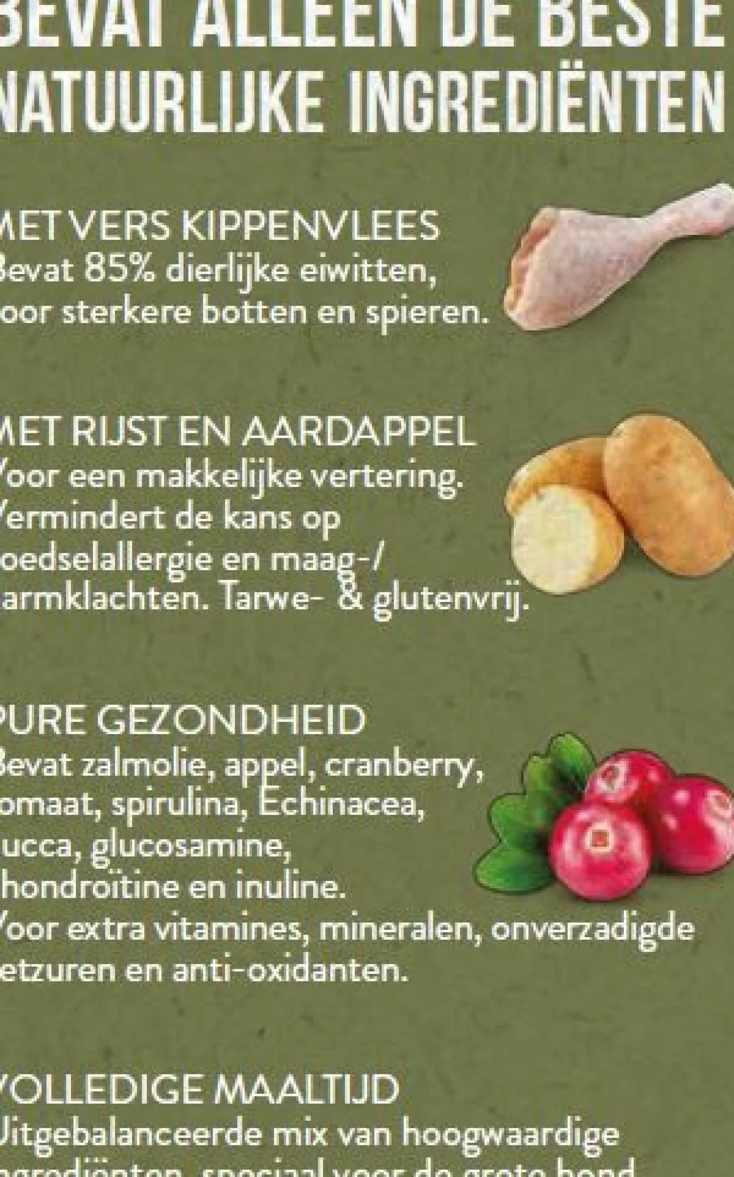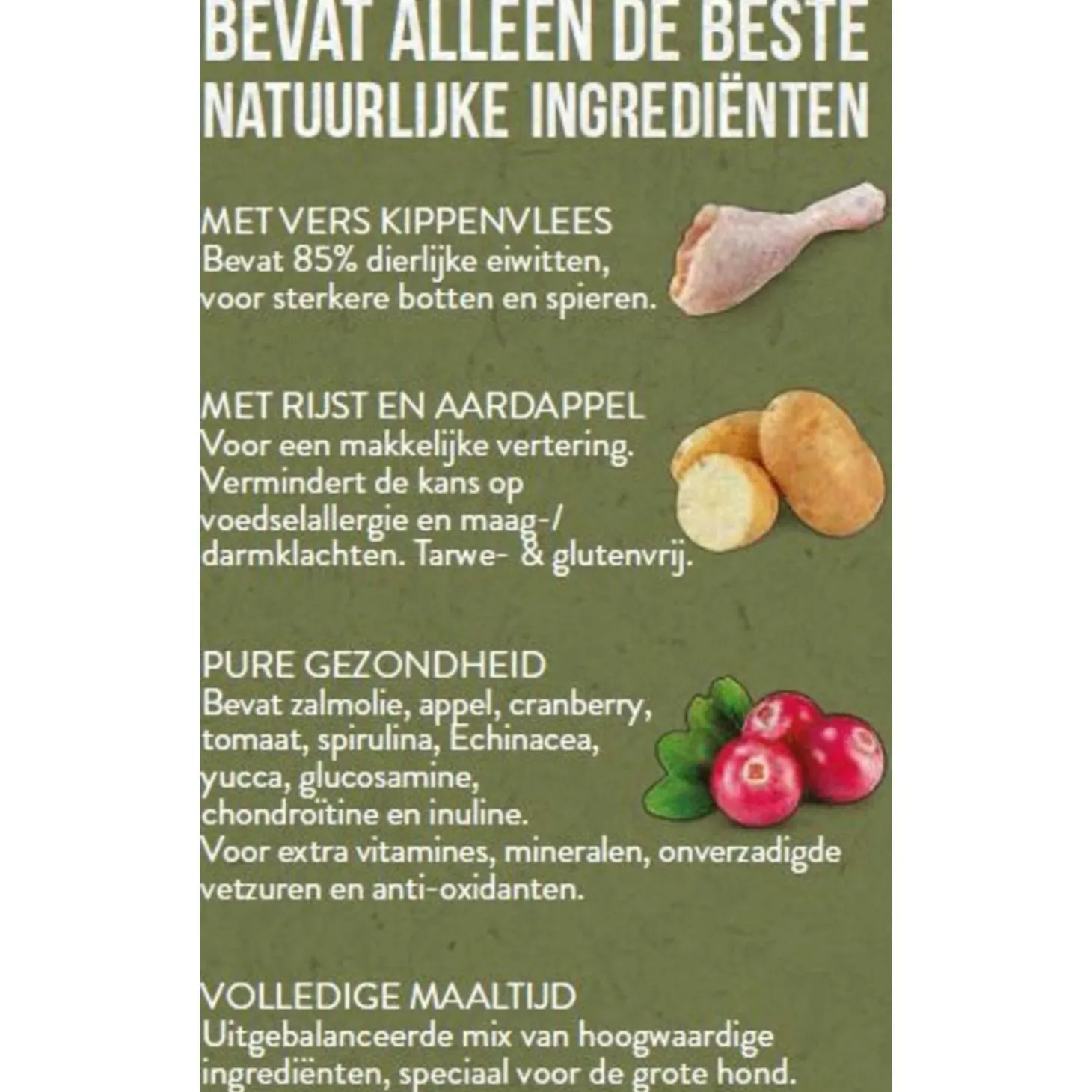 | Samenstelling | Gewicht: 3 kg. Smaak: Kip. Rijst, gedroogde kip, gedroogde aardappel, verse kip (14%), pluimveevet, biergist, zalmolie, zonnebloemolie, eipoeder, inuline (bron van FOS), gedroogde appel, cranberry, gedroogde tomaat, spirulina, Echinacea, chondroïtine, glucosamine, yucca. |
