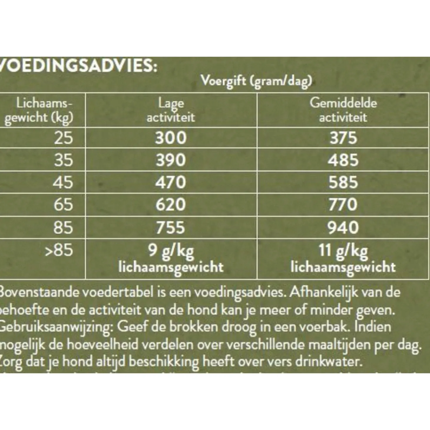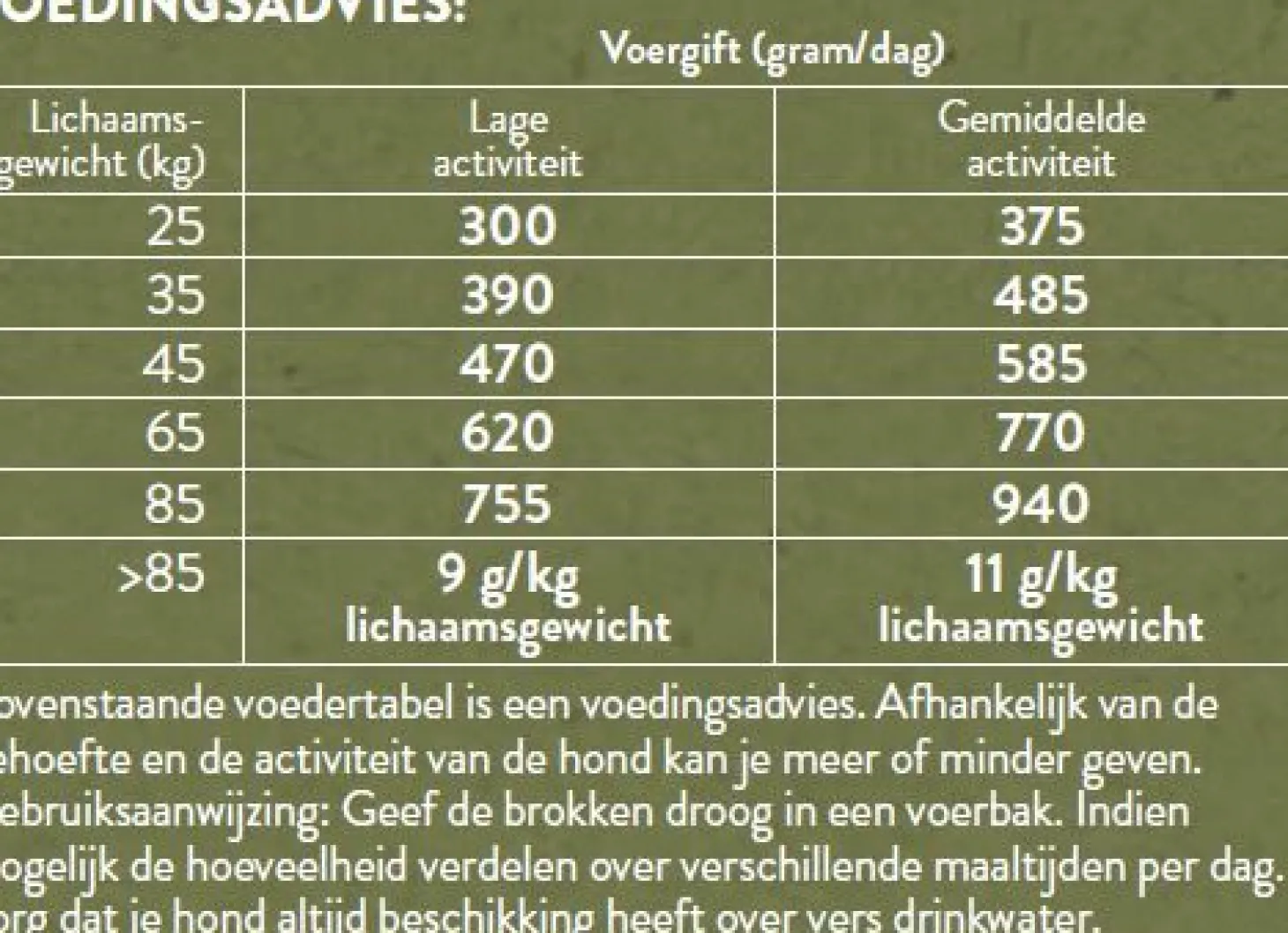 Ons voedingstabel op de verpakking is een voedingsadvies. Afhankelijk van de behoefte en de activiteit van de hond kan je meer of minder geven. Gebruiksaanwijzing: Geef de brokken droog in een voerbak. Indien mogelijk de hoeveelheid verdelen over verschillende maaltijden per dag. Zorg dat je hond altijd beschikking heeft over vers drinkwater. Het product koel, droog en bij voorkeur donker bewaren.