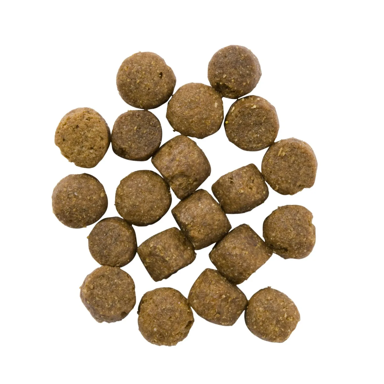 | Samenstelling | Gewicht: 12 kg. Smaak: Gevogelte&Vlees. Gedroogde kip (26%), maïs, rijst (14%), pluimveevet, gedroogde bietenpulp (4%), gedroogde vis, lijnzaad, gedroogde johannesbrood, biergist, mineralen, zalmolie, lecithine (0,5%), eipoeder, inuline (0,3%; bron van FOS), L-carnitine, glucosamine, chondroïtine. |