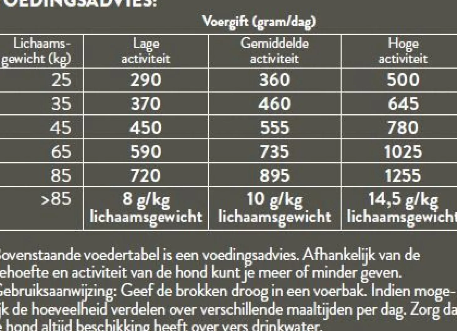 Ons voedingstabel op de verpakking is een voedingsadvies. Afhankelijk van de behoefte en de activiteit van de hond kan je meer of minder geven. Gebruiksaanwijzing: Geef de brokken droog in een voerbak. Indien mogelijk de hoeveelheid verdelen over verschillende maaltijden per dag. Zorg dat je hond altijd beschikking heeft over vers drinkwater. Het product koel, droog en bij voorkeur donker bewaren.
