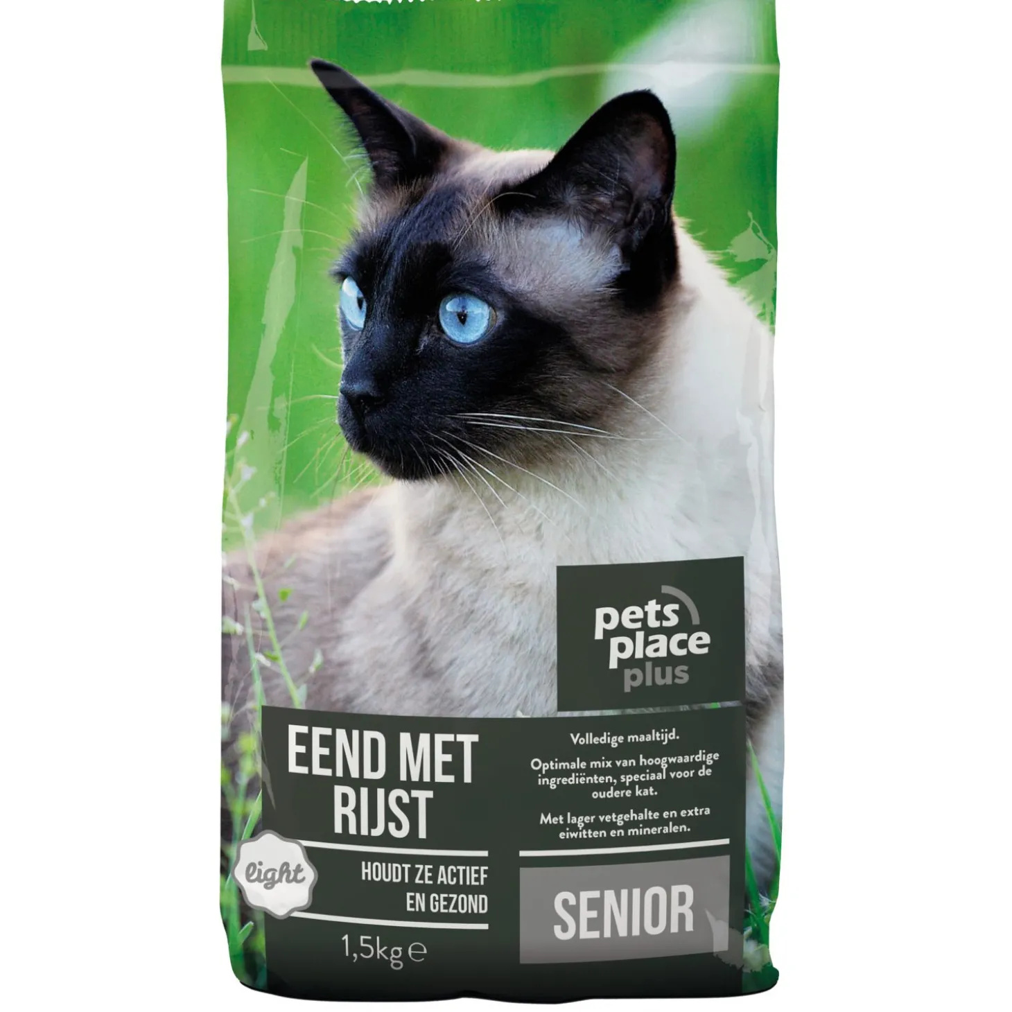 Pets Place Plus Senior Eend met Rijst is speciaal bedoeld voor de ouder wordende kat. De voeding heeft een lager vetgehalte en dit helpt overgewicht voorkomen. Daarnaast is de voeding verrijkt met extra eiwitten en mineralen om ze gezond en actief te houden.