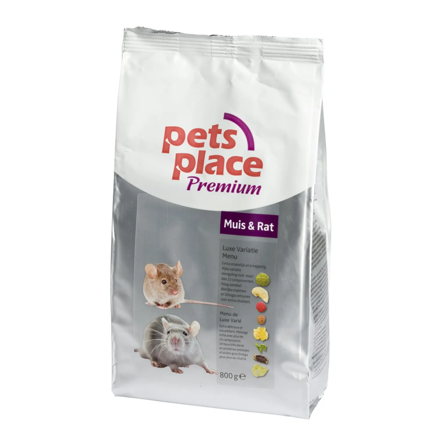 Pets Place Rat en muis luxe menu premium is speciaal samengestelde voeding afgestemd op de natuurlijke voedingsbehoefte van het dier. Pets Place Rat en muis luxe menu premium is verkrijgbaar in verpakking à 800gram.