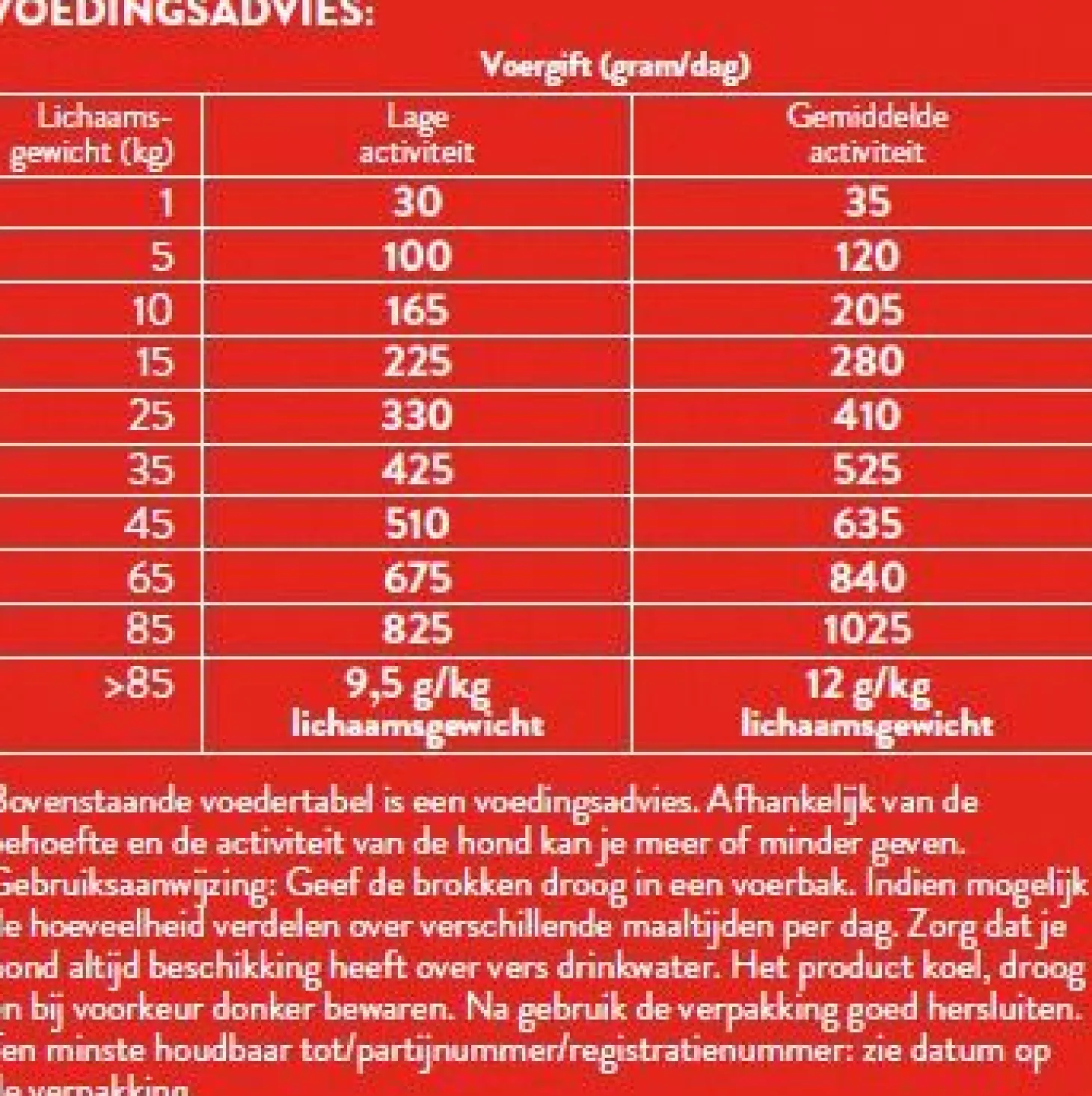 Ons voedingstabel op de verpakking is een voedingsadvies. Afhankelijk van de behoefte en de activiteit van de hond kan je meer of minder geven. Gebruiksaanwijzing: Geef de brokken droog in een voerbak. Indien mogelijk de hoeveelheid verdelen over verschillende maaltijden per dag. Zorg dat je hond altijd beschikking heeft over vers drinkwater. Het product koel, droog en bij voorkeur donker bewaren.