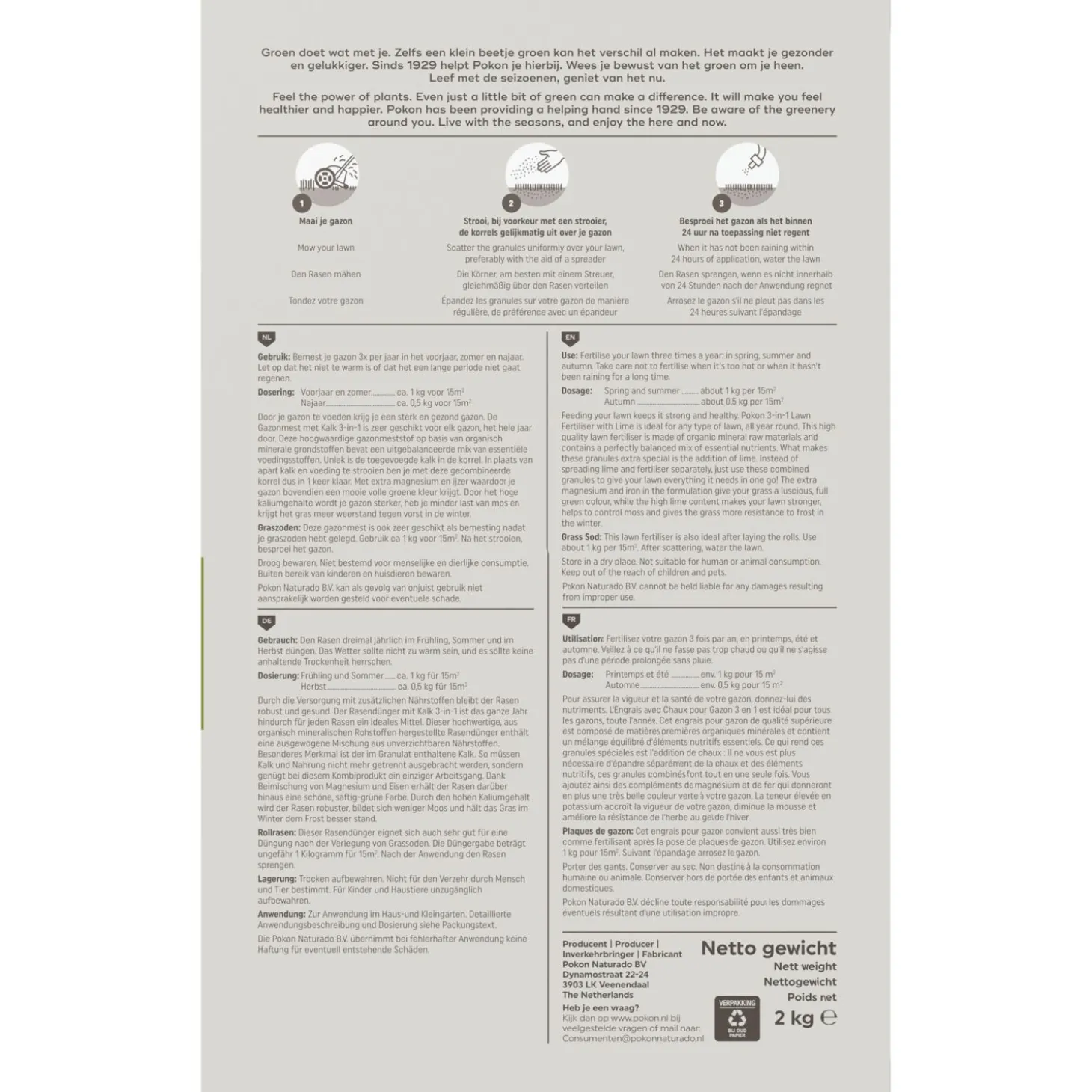 - 3. Besproei het gazon als binnen 24 uur na toepassing niet regent