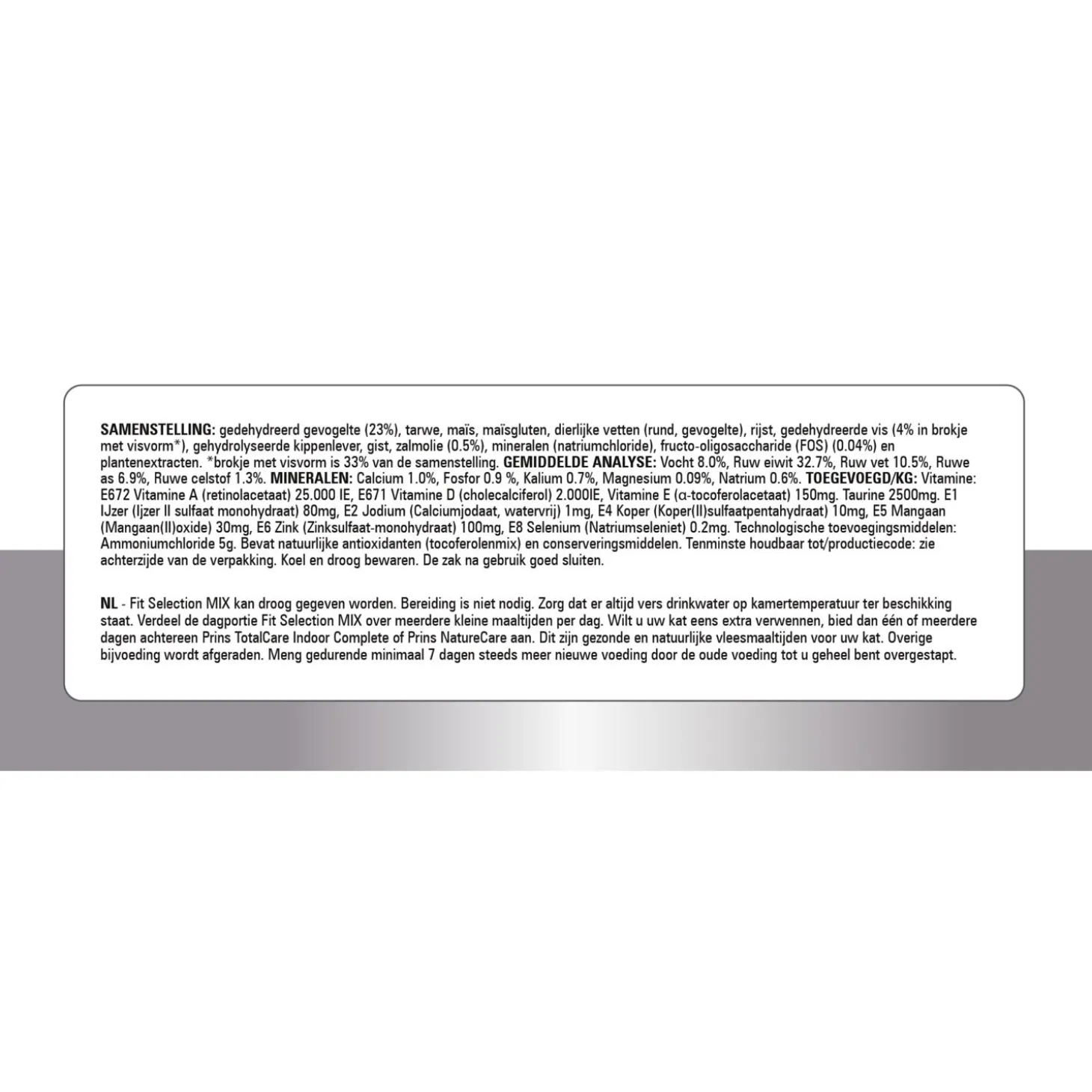 | Aanbeveling | Fit Selection MIX kan droog gegeven worden. Bereiding is niet nodig. Zorg dat er altijd vers drinkwater op kamertemperatuur ter beschikking staat. Verdeel de dagportie Fit Selection MIX over meerdere kleine maaltijden per dag. Overige bijvoeding wordt afgeraden. Koel en droog bewaren. De zak na gebruik goed sluiten. |