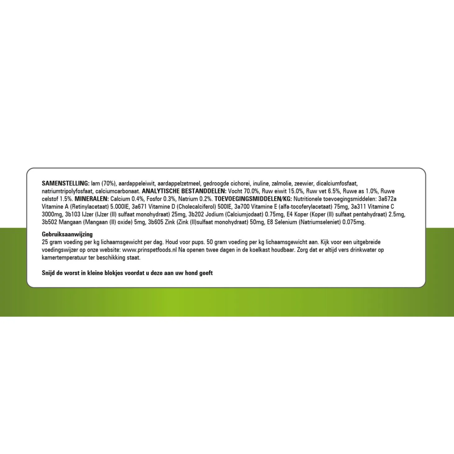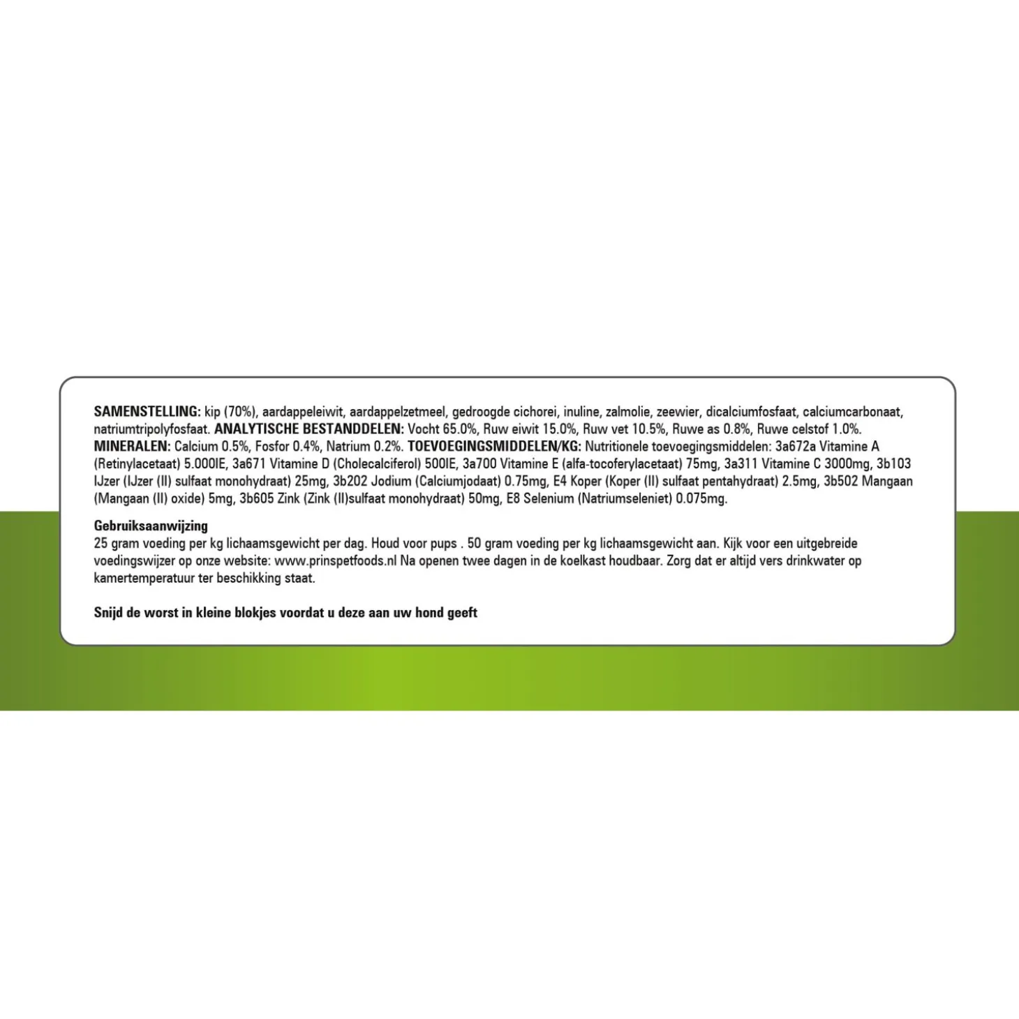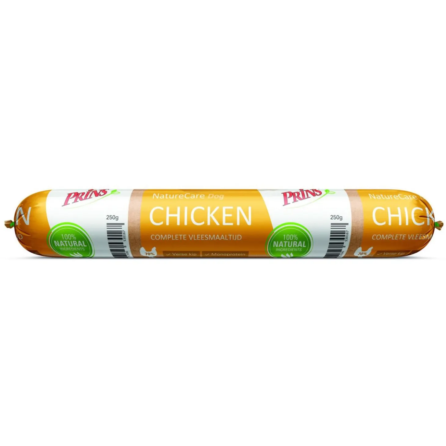 Prins NatureCare bestaat voor 70% uit vers vlees of gevogelte. Voor deze voeding is enkel de beste kwaliteit kip, kalkoen of lam gebruikt, aangevuld met ingrediënten zoals groenten, oliën, vitaminen en mineralen. Door de speciale bereidingswijze zijn de worsten ongeopend (!) buiten de koeling houdbaar.