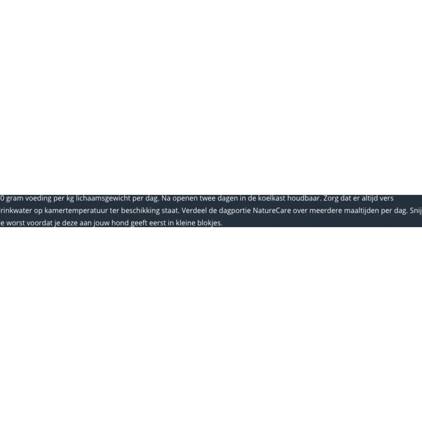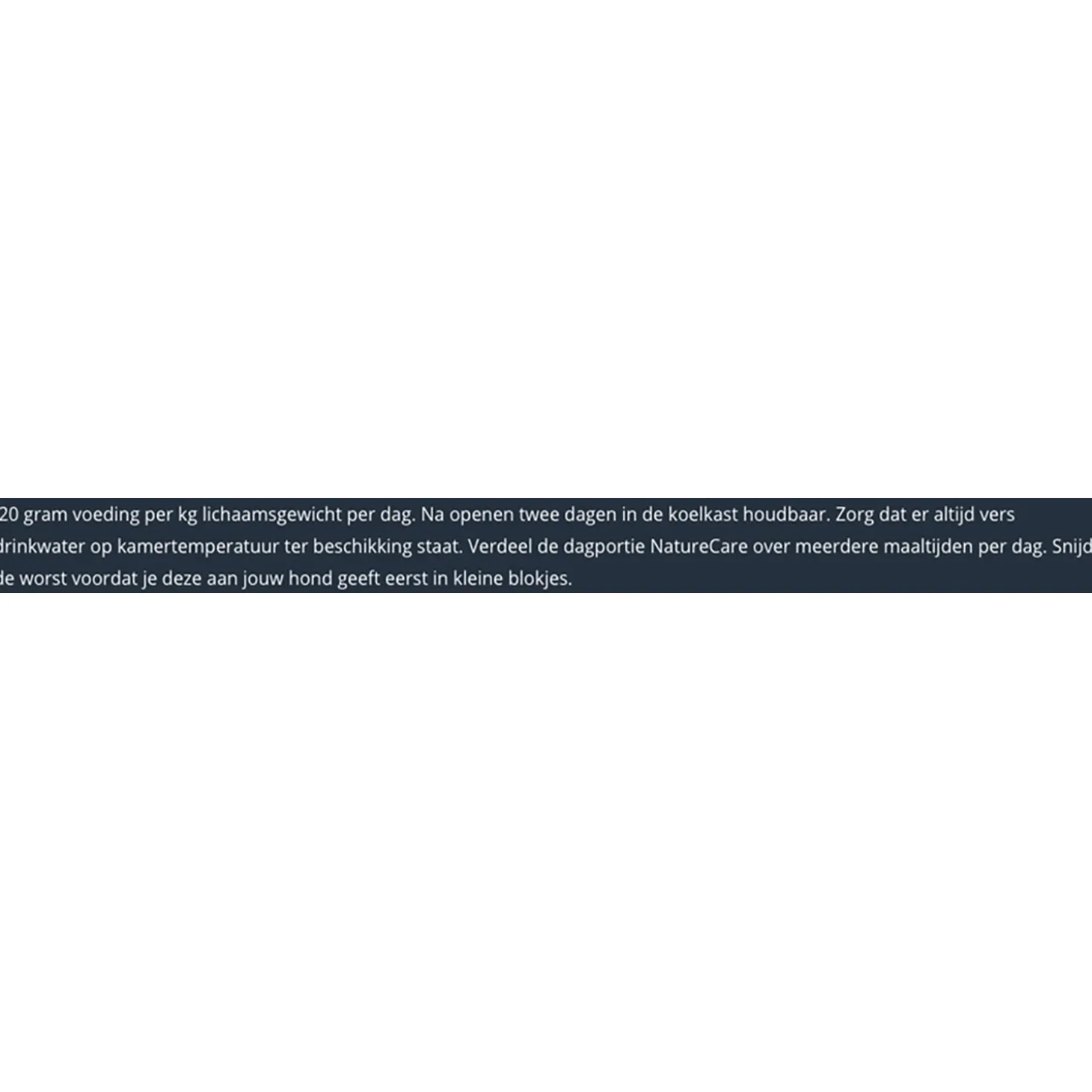 | Aanbeveling | Na openen twee dagen in de koelkast houdbaar. Zorg dat er altijd vers drinkwater op kamertemperatuur ter beschikking staat. Verdeel de dagportie NatureCare over meerdere maaltijden per dag. Snijd de worst voordat je deze aan jouw hond geeft eerst in kleine blokjes. |