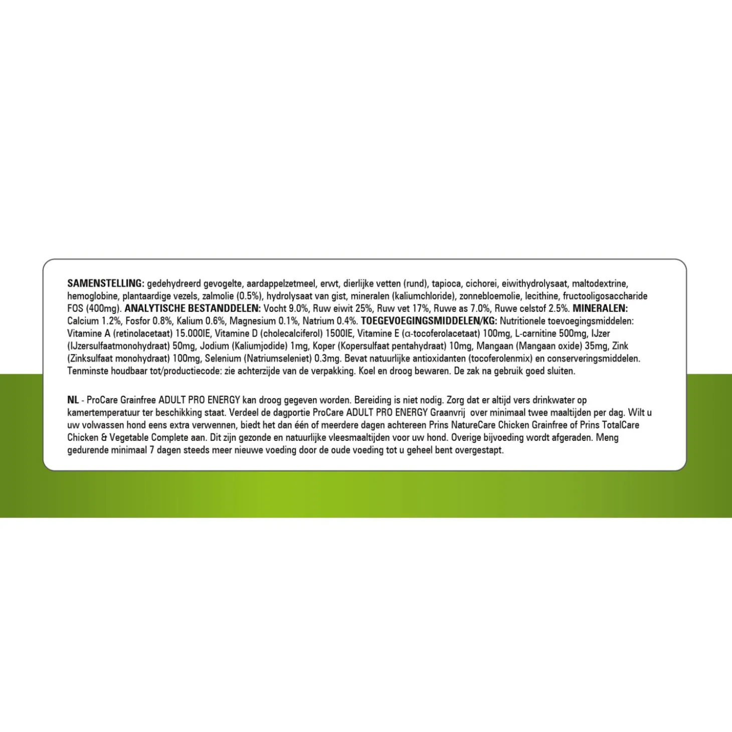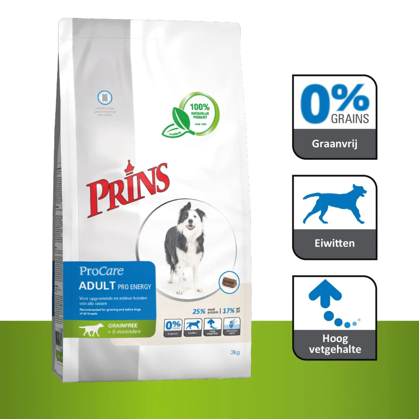 Prins ProCare Grainfree Adult Pro Energy is verkrijgbaar in 3 kg en 12 kg.
