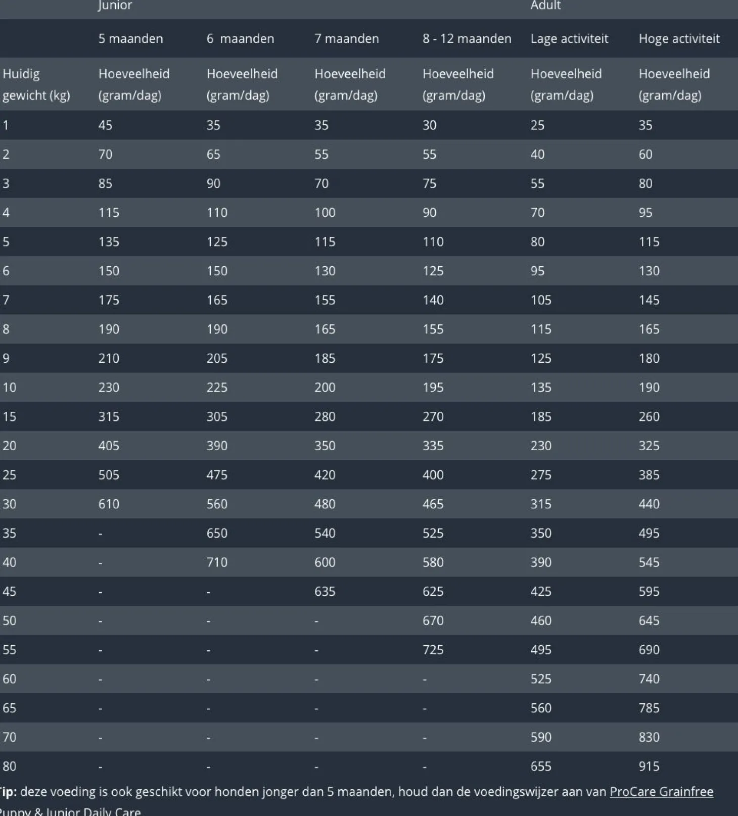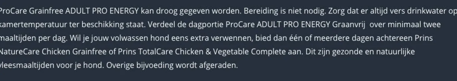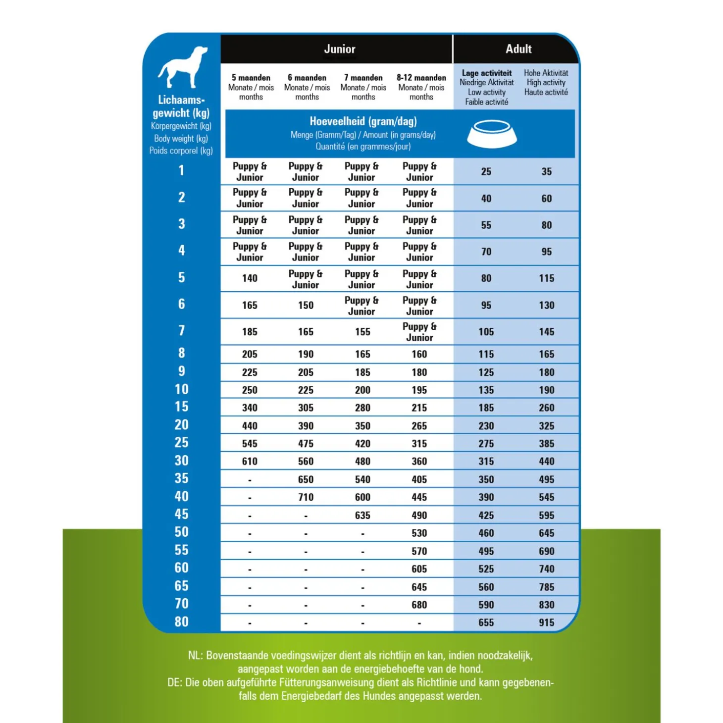 | Aanbeveling | Verdeel de dagportie over minimaal twee maaltijden per dag. Zorg dat er altijd vers drinkwater op kamertemperatuur ter beschikking staat. Meng gedurende minimaal 7 dagen steeds meer nieuwe voeding door de oude voeding tot jegeheel bent overgestapt. Bewaaradvies: koel en droog bewaren. Sluit de zak na gebruik goed af. |