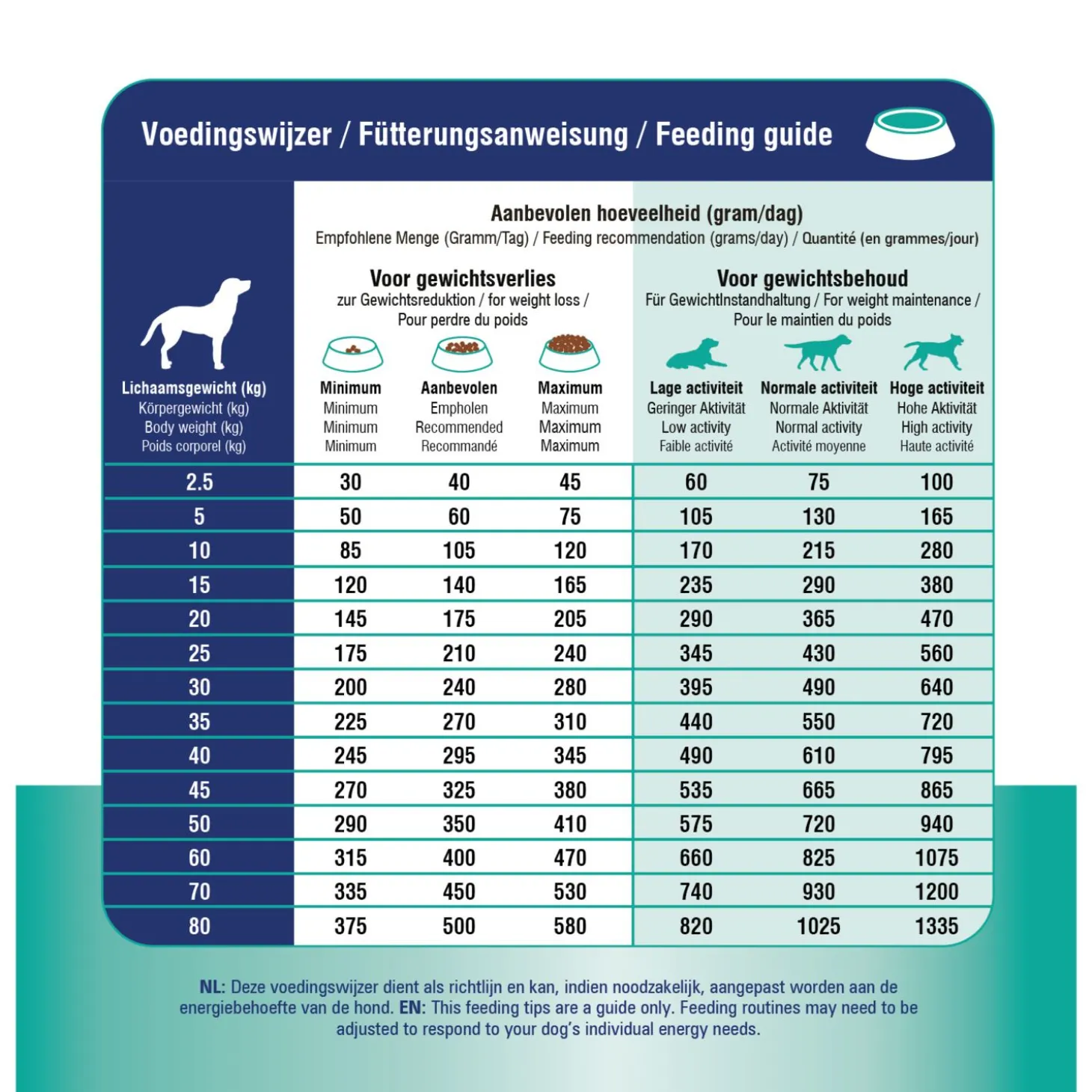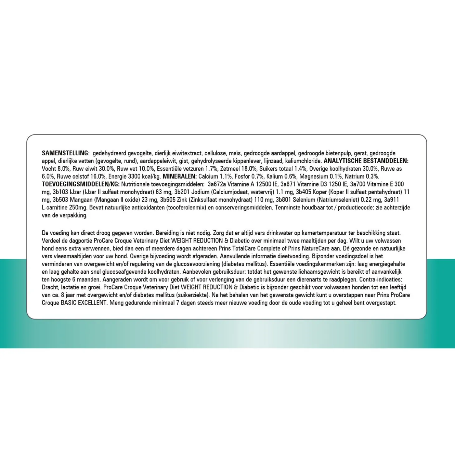 | Aanbeveling | ProCare Croque Veterinary Diet Weight Reduction & Diabetic kan droog worden gegeven. Bereiding is niet nodig. Verdeel de dagelijkse portie voeding over meerdere kleine maaltijden per dag. Overige bijvoeding wordt afgeraden. Aanbevolen gebruiksduur, bij regulering van de glucosevoorziening (diabetes mellitus): aanvankelijk ten hoogste zes maanden, bij vermindering van overgewicht: totdat het gewenste lichaamsgewicht is bereikt en nadien indien nodig om het gewenste lichaamsgewicht in stand te houden. Voor efficiënt gewichtsverlies of de instandhouding van het ideale gewicht mag de aanbevolen dagelijkse energie-inname niet worden overschreden. Aangeraden wordt om vóór gebruik of vóór verlenging van de gebruiksduur een dierenarts te raadplegen. Na verlenging van de gebruiksperiode kan de voeding levenslang worden gegeven. Water moet altijd beschikbaar zijn. |