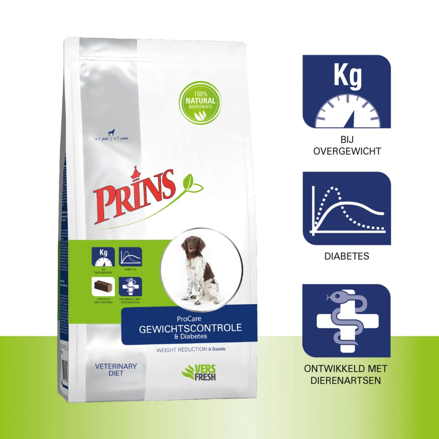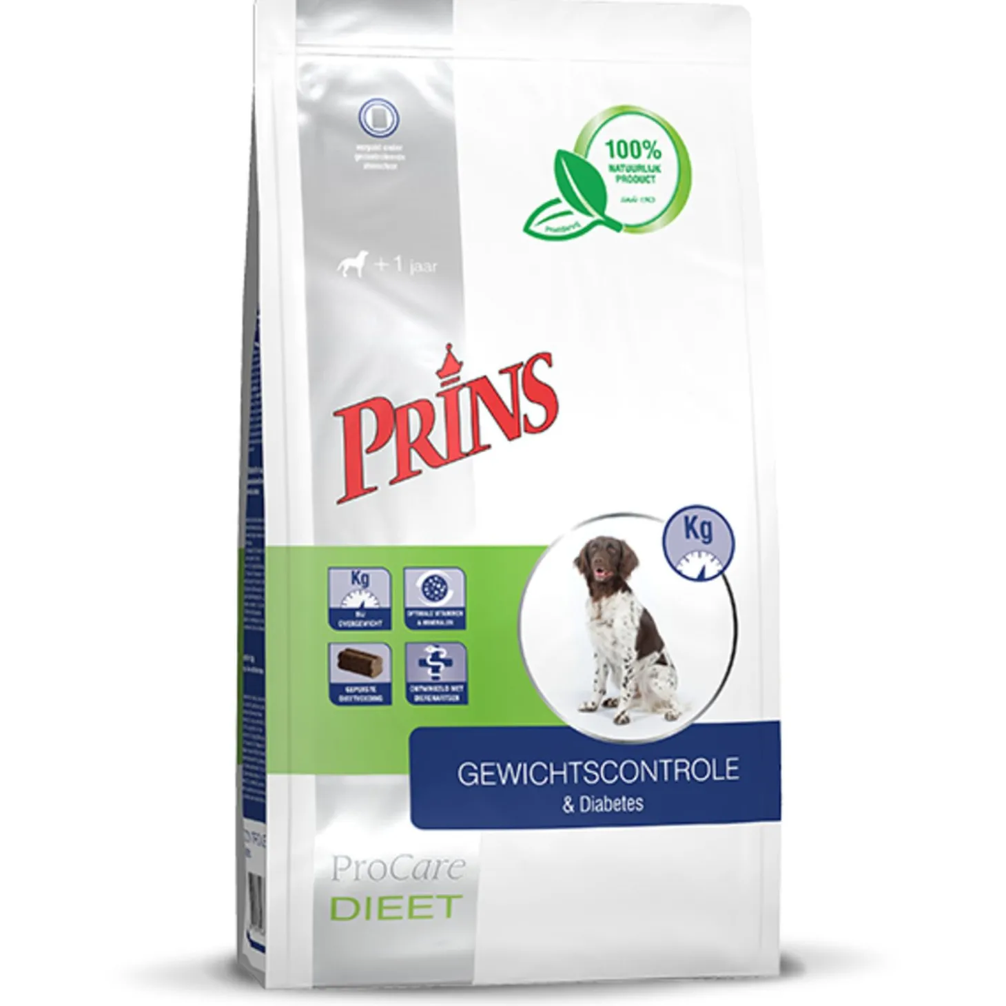 Prins ProCare Veterinary Diet Gewichtscontrole en Diabetes is verkrijgbaar in 3 kg en 15 kg.
