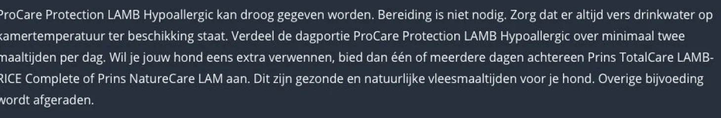 | Aanbeveling | ProCare Protection Lamb Hypoallergic kan droog gegeven worden. Bereiding is niet nodig. Zorg dat er altijd vers drinkwater op kamertemperatuur ter beschikking staat. Verdeel de dagportie over minimaal twee maaltijden per dag. Meng gedurende minimaal 7 dagen steeds meer nieuwe voeding door de oude voeding tot u geheel bent overgestapt. Koel en droog bewaren. De zak na gebruik goed sluiten. |
