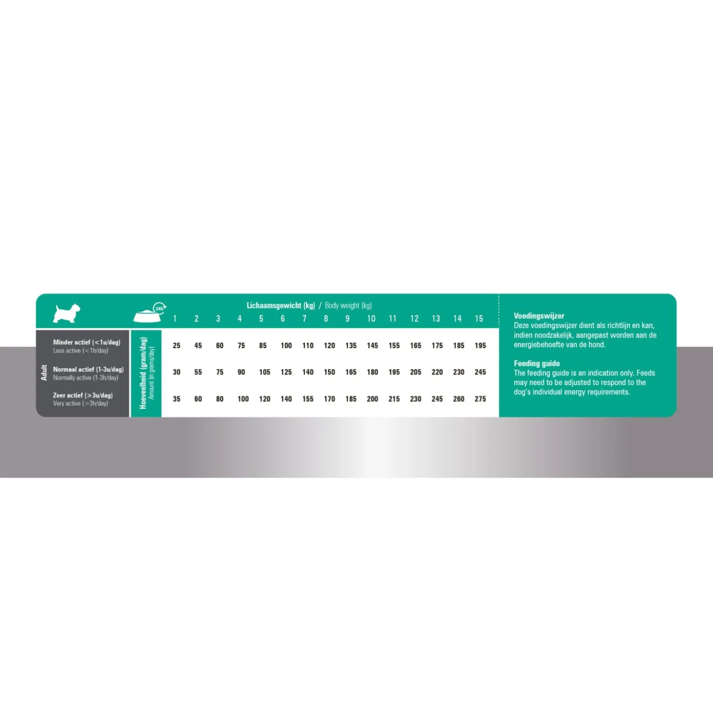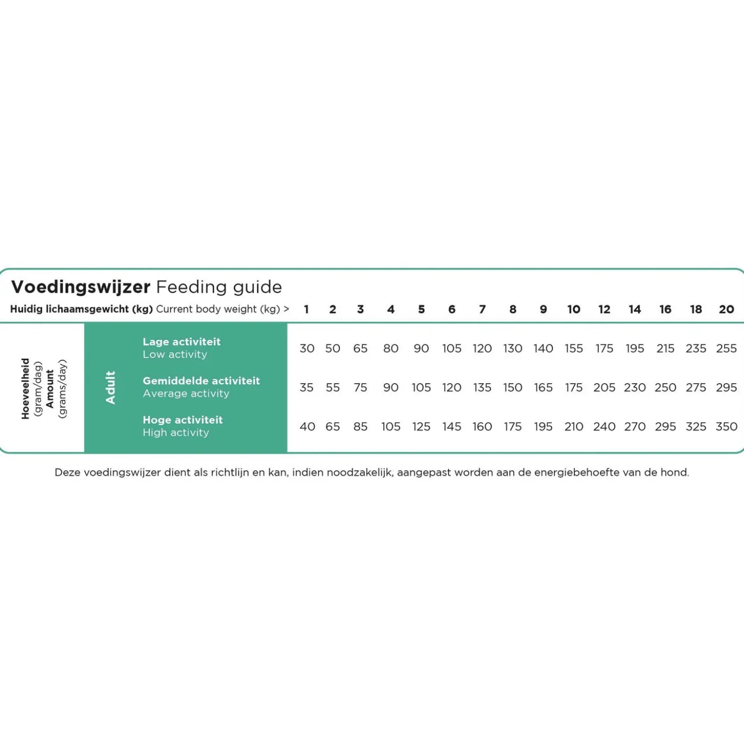 | Aanbeveling | Verdeel de dagelijkse portie voedsel over minimaal twee maaltijden per dag. Zorg dat er altijd voldoende vers water voor je hond klaar staat. Meng gedurende minimaal 7 dagen steeds meer nieuwe voeding door de oude voeding tot je geheel bent overgestapt. Bewaar advies: koel en droog bewaren. Sluit de zak na gebruik goed af. Ten minste houdbaar tot/productiecode: zie achterkant verpakking. |