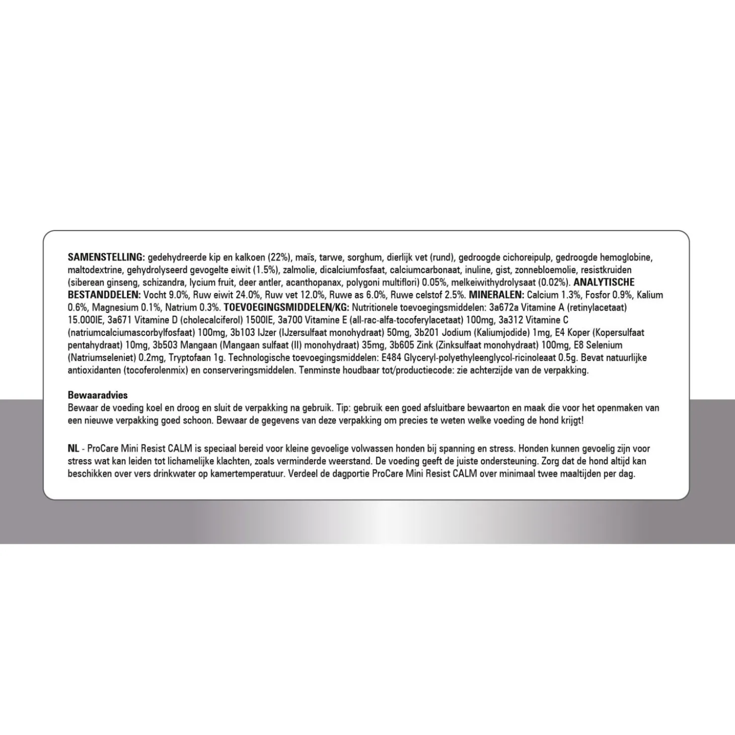 | Samenstelling | Samenstelling: gevogeltemeel (21,0%), maïs, tarwe, sorghum, gehydrolyseerd gevogelte eiwit (4,5%), rundvet, gedroogde cichoreipulp (2,0%), cellulose, kruidenmengsel (groene thee, passiebloem, kamille) (1,7%), zonnebloemolie, fructo-oligosachariden (FOS) (0,5%), algenolie (0,2%), gehydrolyseerde gist. |