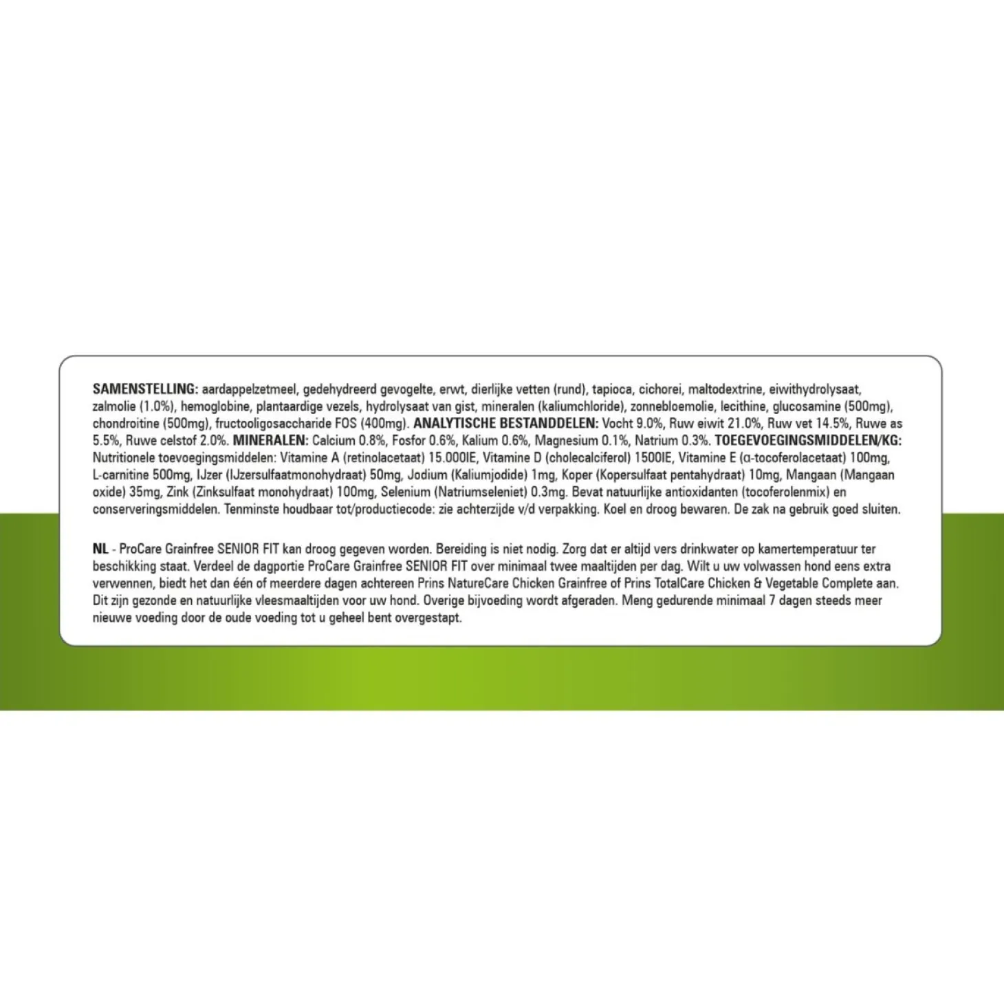 | Samenstelling | Samenstelling: aardappelzetmeel, erwt, gevogeltemeel (10,0%), aardappeleiwit, rundvet, gehydrolyseerd gevogelte eiwit, cichoreipulp, cellulose, zonnebloemolie, fructooligosacharide (FOS), algenolie (0,4%), kaliumchloride, gisthydrolysaat, glucosamine (500mg), chondroitine (500mg), fructooligosacharide (FOS). |