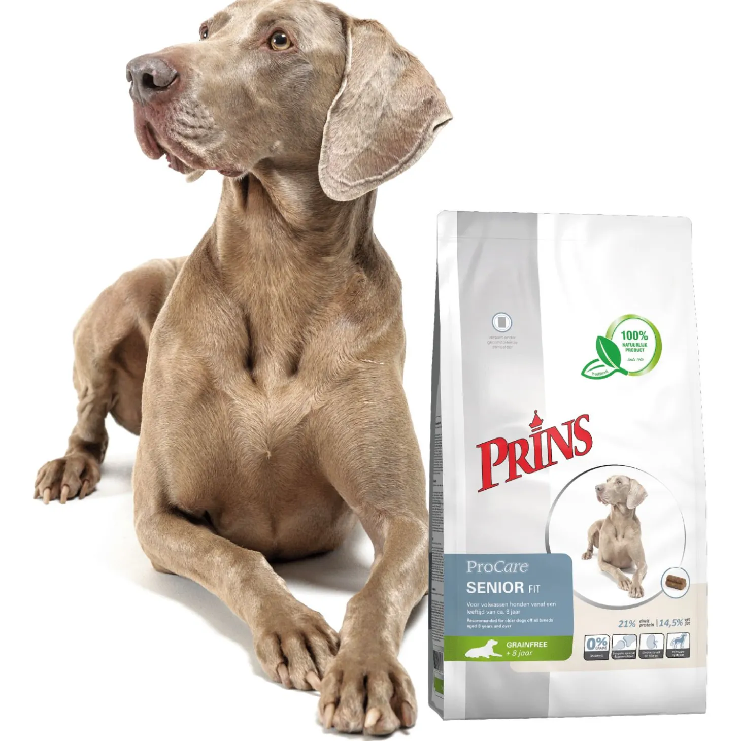 Prins ProCare Grainfree Senior Fit is verkrijgbaar in 3 kg en 12 kg.