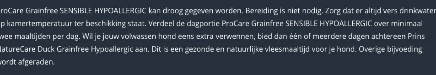 | Aanbeveling | Verdeel de dagportie over minimaal twee maaltijden per dag. Zorg dat er altijd vers drinkwater op kamertemperatuur ter beschikking staat. Meng gedurende minimaal 7 dagen steeds meer nieuwe voeding door de oude voeding tot jegeheel bent overgestapt. Bewaaradvies: koel en droog bewaren. Sluit de zak na gebruik goed af. |