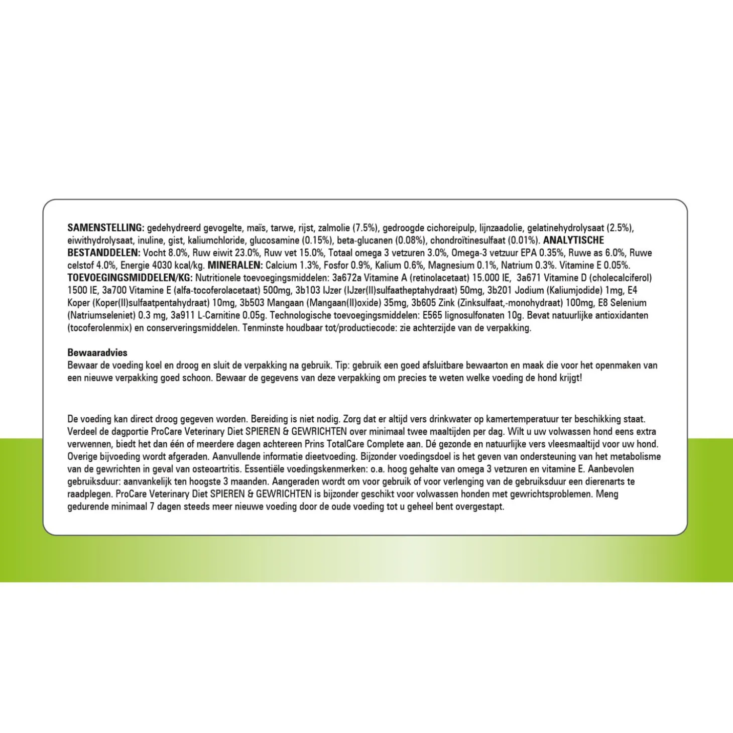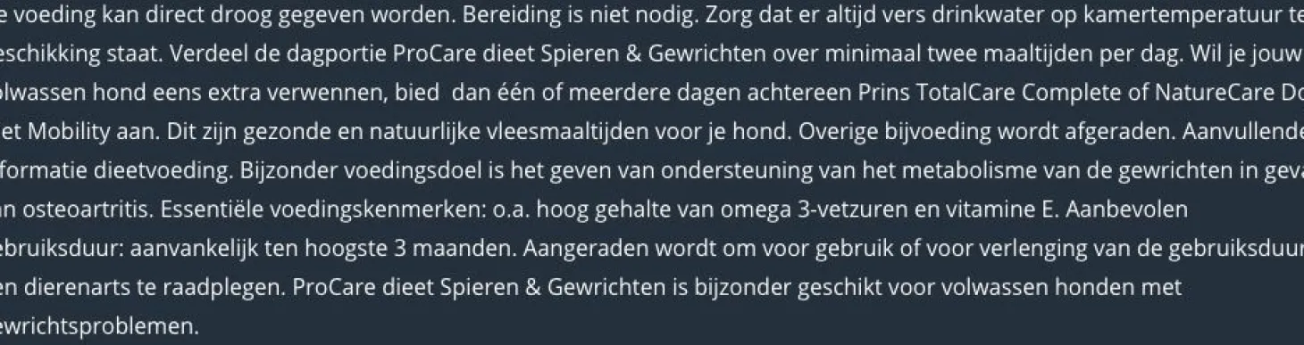 | Aanbeveling | ProCare Pressed Veterinary Diet Mobility kan droog worden gegeven. Bereiding is niet nodig. Verdeel de dagelijkse portie voeding over meerdere kleine maaltijden per dag. Overige bijvoeding wordt afgeraden. Aanbevolen gebruiksduur ter ondersteuning van het metabolisme van de gewrichten in geval van osteoartritis: aanvankelijk ten hoogste drie maanden. Aangeraden wordt om vóór gebruik of vóór verlenging van de gebruiksduur een dierenarts te raadplegen. Na verlenging van de gebruiksperiode kan de voeding levenslang worden gegeven. Water moet altijd beschikbaar zijn. |