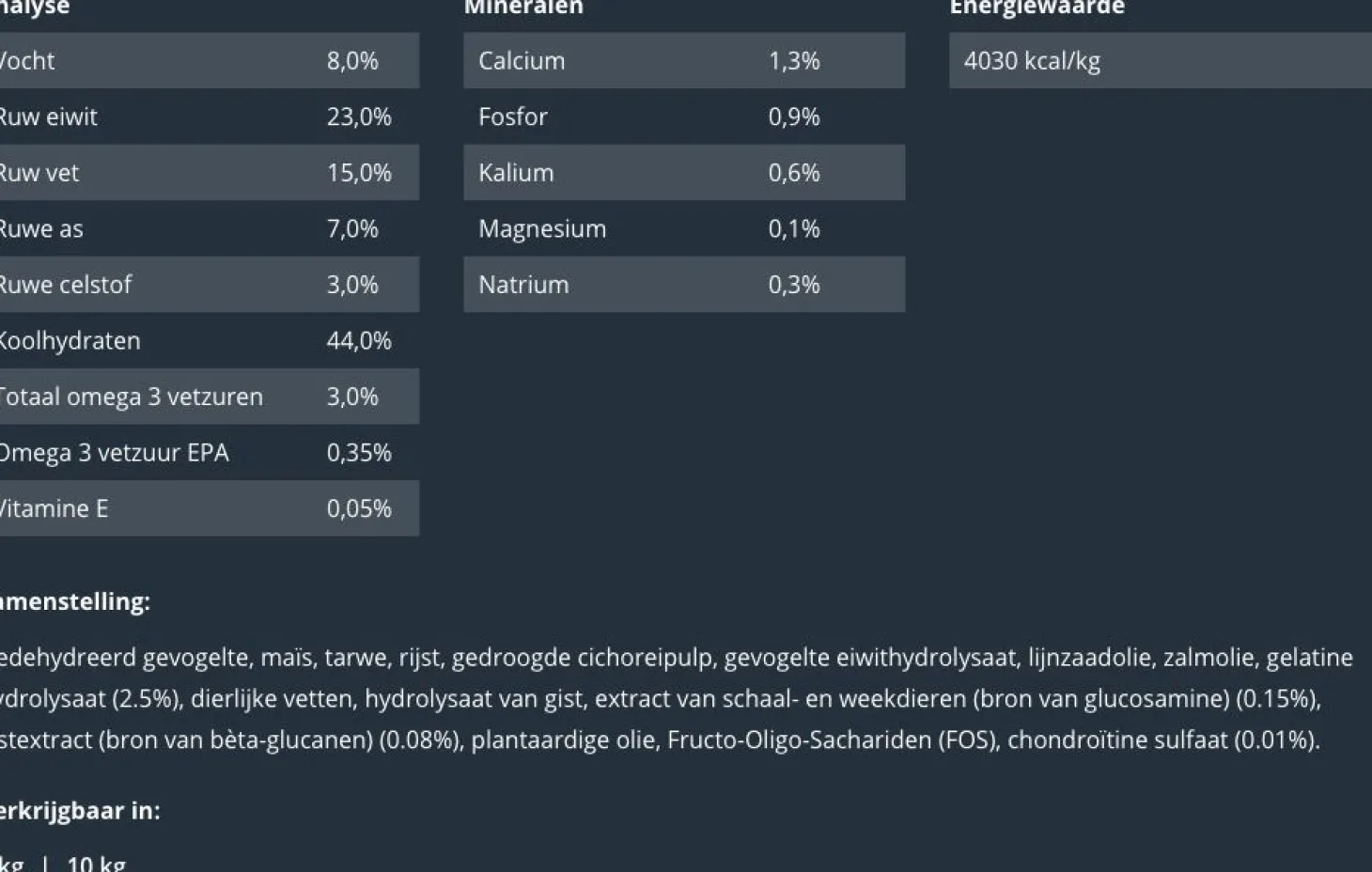 | Analyse | Analytische bestanddelen: vocht 8,0%, ruw eiwit 26,0%, ruw vet 13,5%, totaal omega 3-vetzuren 3,0%, EPA 0,5%, ruwe as 7,3%, ruwe celstof 5,3%, vitamine E 0,05%, Energiegehalte 3.550 kcal/kg. Mineralen: calcium 1,4%, fosfor 1,0%, kalium 0,6%, magnesium 0,1%, natrium 0,3%. |