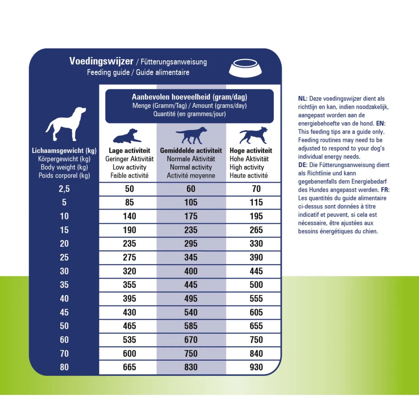 | Samenstelling | Samenstelling: gedehydreerd gevogelte, tarwe, maïs, rijst, gedroogde cichoreipulp, lijnzaadolie, gevogelte eiwithydrolysaat, gelatine hydrolysaat (2,5%), algenolie (2,0%), gisthydrolysaat, extract van schaal- en weekdieren (bron van glucosamine) (0,15%), gistextract (bron van bèta-glucanen) (0,08%), plantaardige olie, fructo-oligosachariden (FOS), chondroïtine sulfaat (0,01%). |