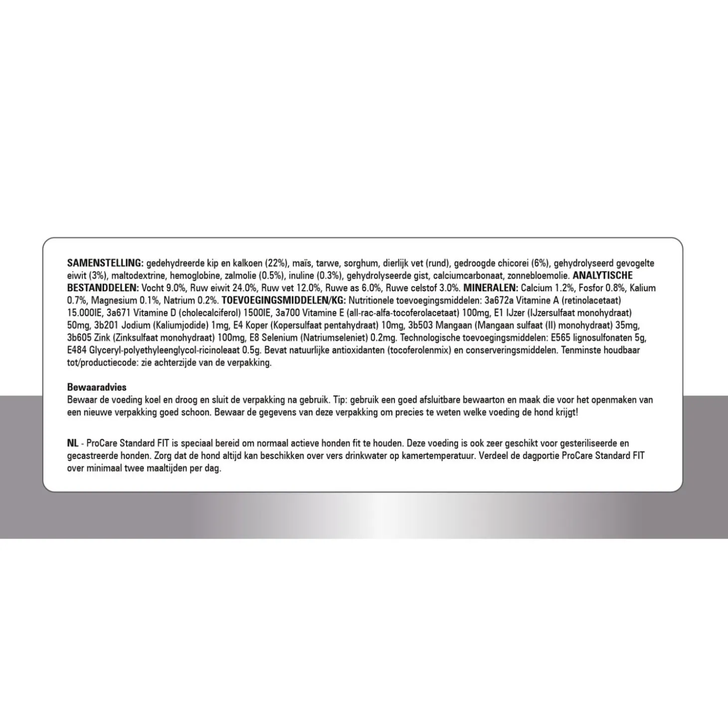 | Samenstelling | Samenstelling: gevogeltemeel (21,0%), maïs, tarwe, sorghum, gehydrolyseerd gevogelte eiwit (4,5%), gedroogde cichoreipulp (2,0%), rundvet, cellulose, zonnebloemolie, fructo-oligosachariden (FOS) (0,5%), algenolie (0,2%), gehydrolyseerde gist. |