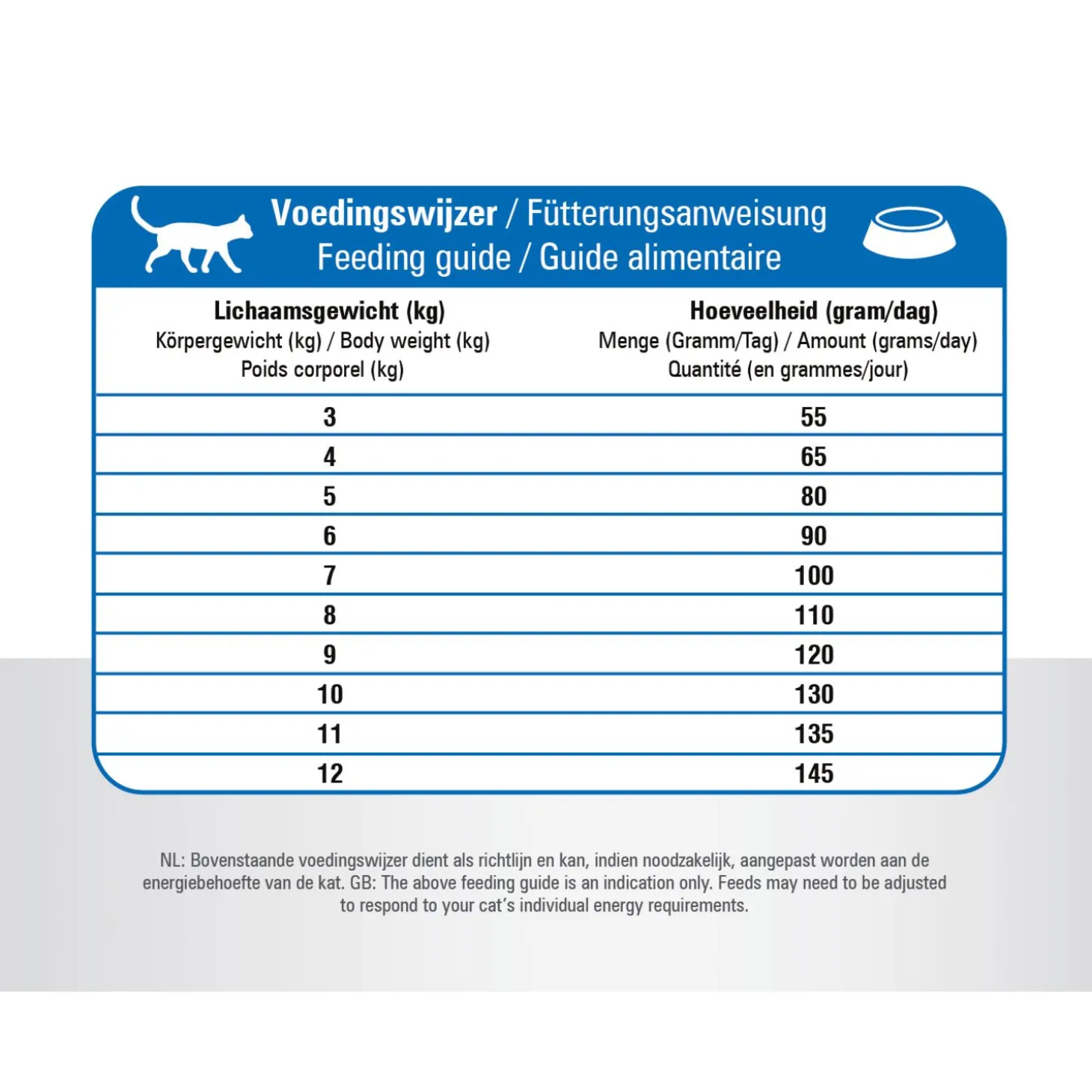 Deze volledige maaltijd voorziet jouw grote kat van alle energie die ze nodig heeft. De brok is speciaal afgestemd op grote katten, zo zijn ingrediënten als zalmolie, glucosamine en chondroïtine toegevoegd om de gewrichten te ondersteunen. Ook is de vorm en grootte van de brok aangepast zodat dit beter past bij het kauwgedrag en de voedingsopname van grote katten. Om de huid en vacht gezond te houden, zit er zalmolie in de voeding, wat van nature rijk is aan omega 3-vetzuren. Als laatste zorgen de met zorg geselecteerde ingrediënten voor gezonde urinewegen.