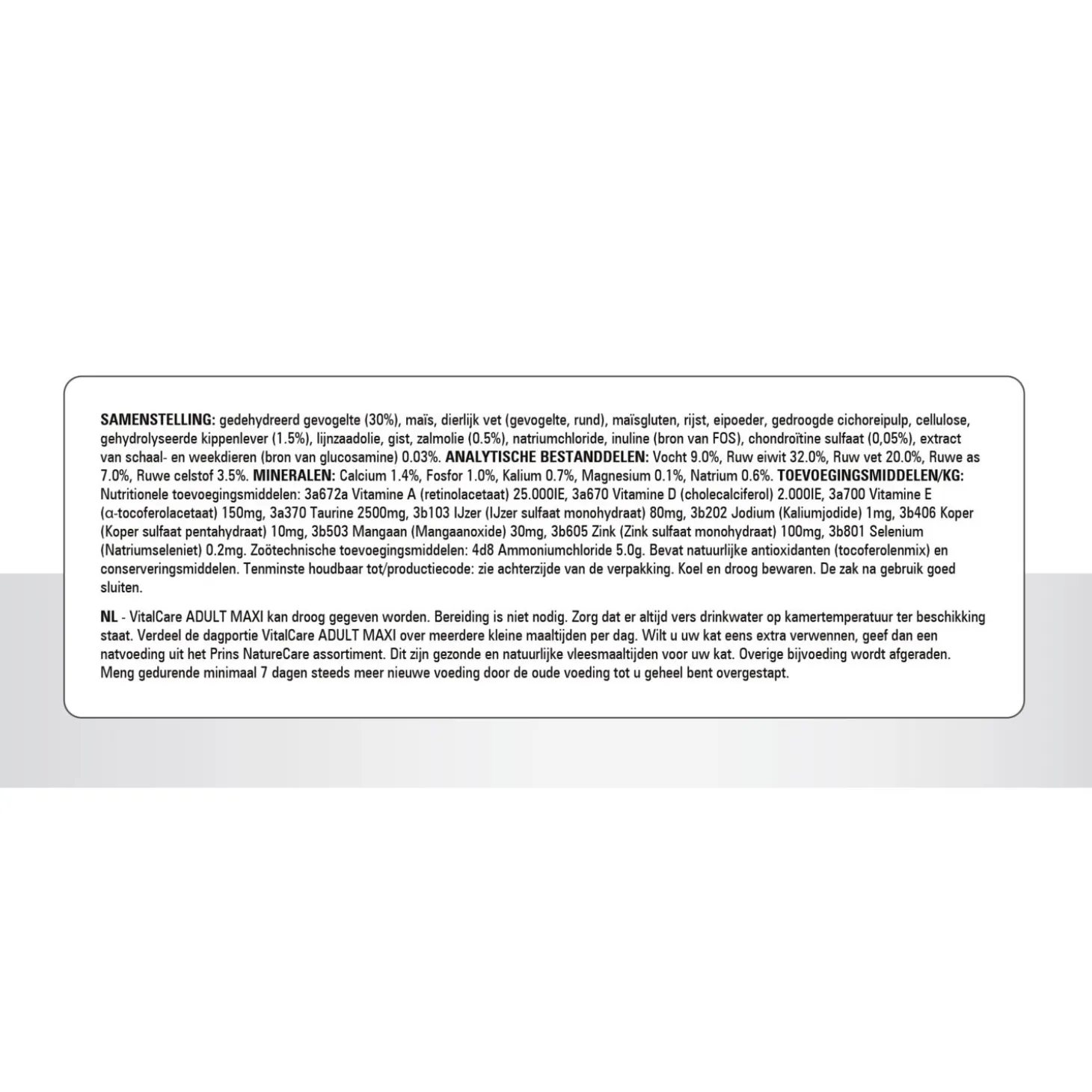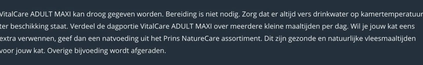 | Aanbeveling | VitalCare Adult Maxi kan droog gegeven worden. Bereiding is niet nodig. Zorg dat er altijd vers drinkwater op kamertemperatuur ter beschikking staat. Verdeel de dagportie over meerdere kleine maaltijden per dag. Meng gedurende minimaal 7 dagen steeds meer nieuwe voeding door de oude voeding tot je geheel bent overgestapt. |