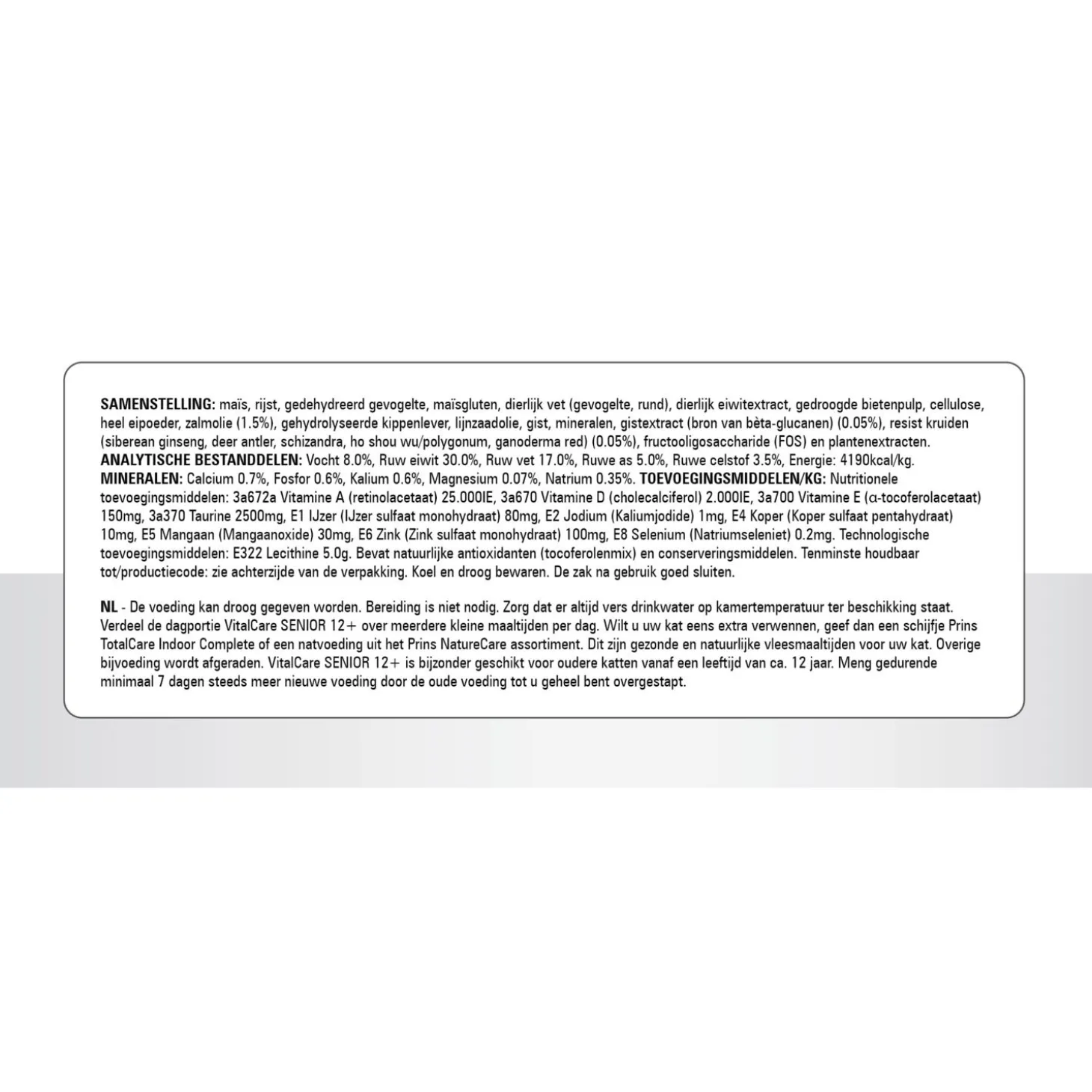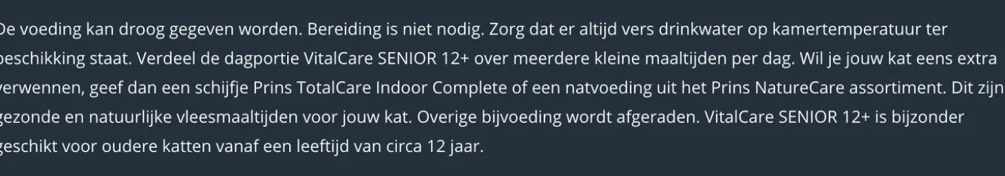 | Aanbeveling | VitalCare Senior 12+ kan droog gegeven worden. Bereiding is niet nodig. Zorg dat er altijd vers drinkwater op kamertemperatuur ter beschikking staat. Verdeel de dagportie VitalCare Senior 12+ over meerdere kleine maaltijden per dag. Meng gedurende minimaal 7 dagen steeds meer nieuwe voeding door de oude voeding tot je geheel bent overgestapt. |