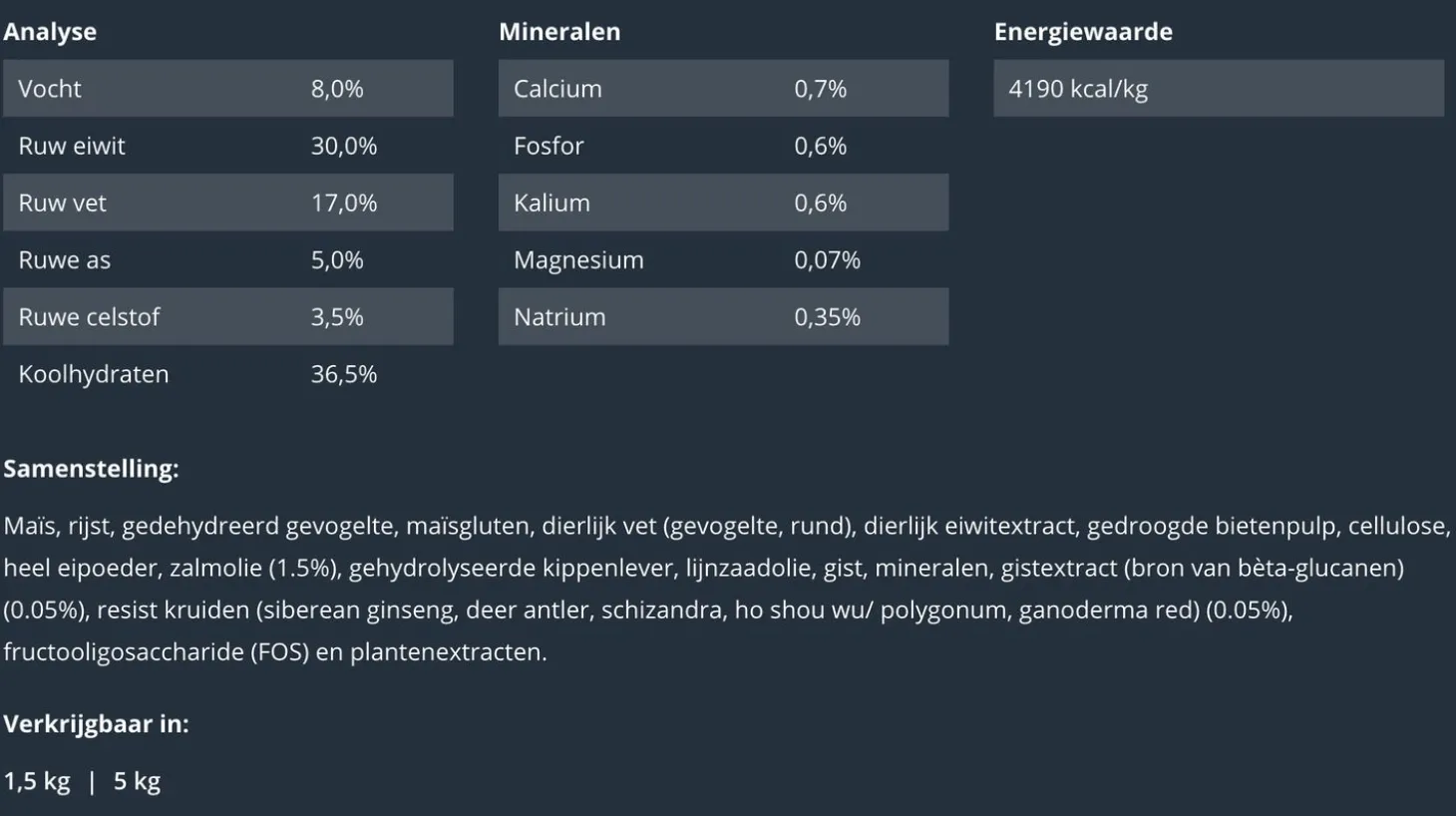 | Samenstelling | Samenstelling: maïs, rijst, maïsgluten, gedehydreerd gevogelte (14,0%), dierlijk eiwitextract, gevogeltevet, gedroogde cichoreipulp, cellulose, heel eipoeder (2,0%), rundvet, visolie (1,5%), kippenleverhydrolysaat, lijnzaadolie, gist, gistextract (bron van bèta-glucanen) (0,05%), resist kruiden (eleutherococci radix, lycii chinense fructus, polygoni multiflori rad, ganodermatis fructificat, schizandrae fructus, acanthopanacis radicis c, dipsaci radix, cuscutae semen, curculiginis rhizoma, dioscoreae oppositae rh) (0,05%), fructo-oligosaccharide (FOS). |