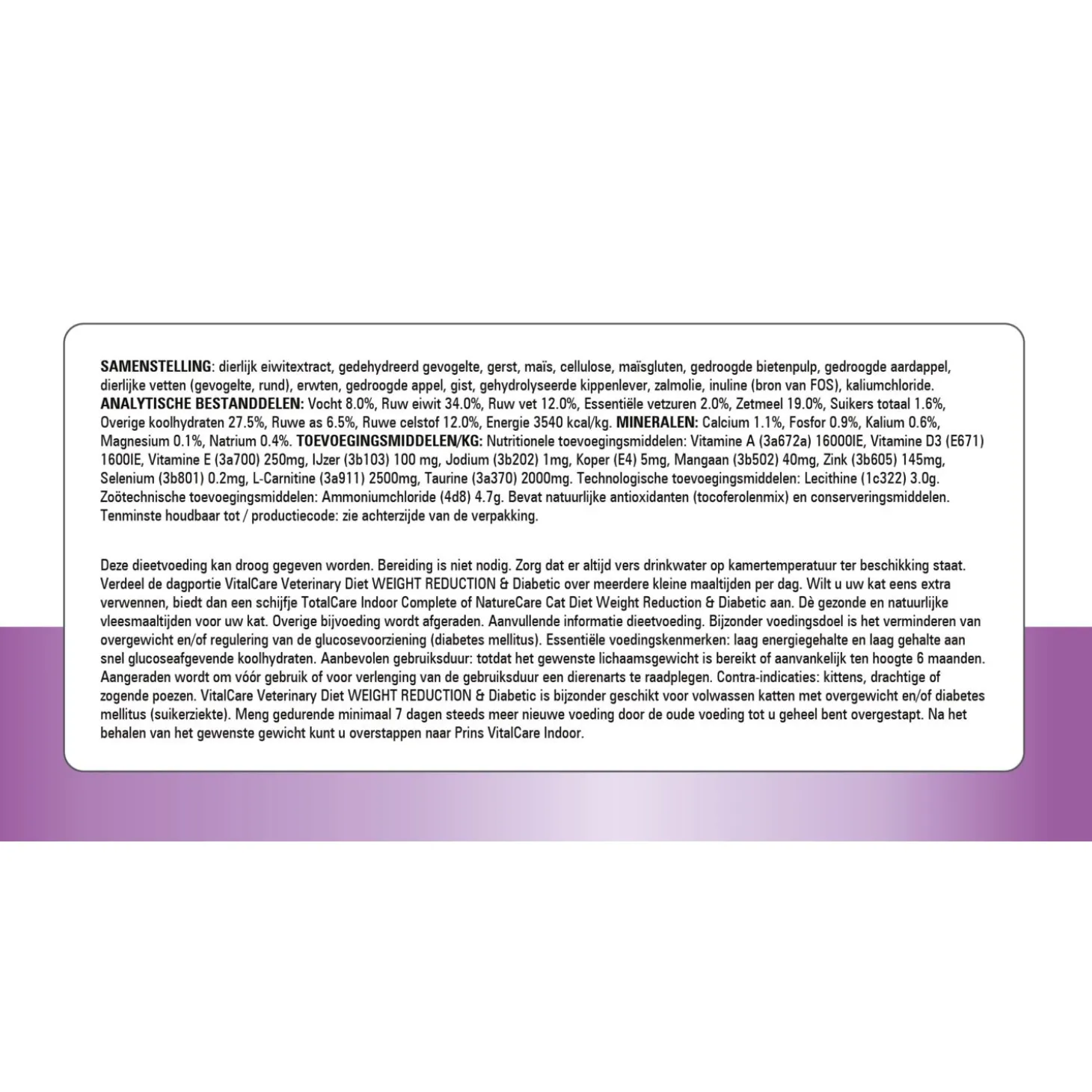 Let op: Weight Reduction & Diabetic is een dieetvoeding. De aanbevolen gebruiksduur is totdat het gewenste lichaamsgewicht is bereikt of aanvankelijk ten hoogte 6 maanden. Nadat het gewenste gewicht is behaald, kan je over stappen op een passende voeding zoals Prins VitalCare Indoor. Aangeraden wordt om vóór gebruik of voor verlenging van de gebruiksduur een dierenarts te raadplegen. Gebruik het voer niet bij kittens, drachtige of zogende poezen.