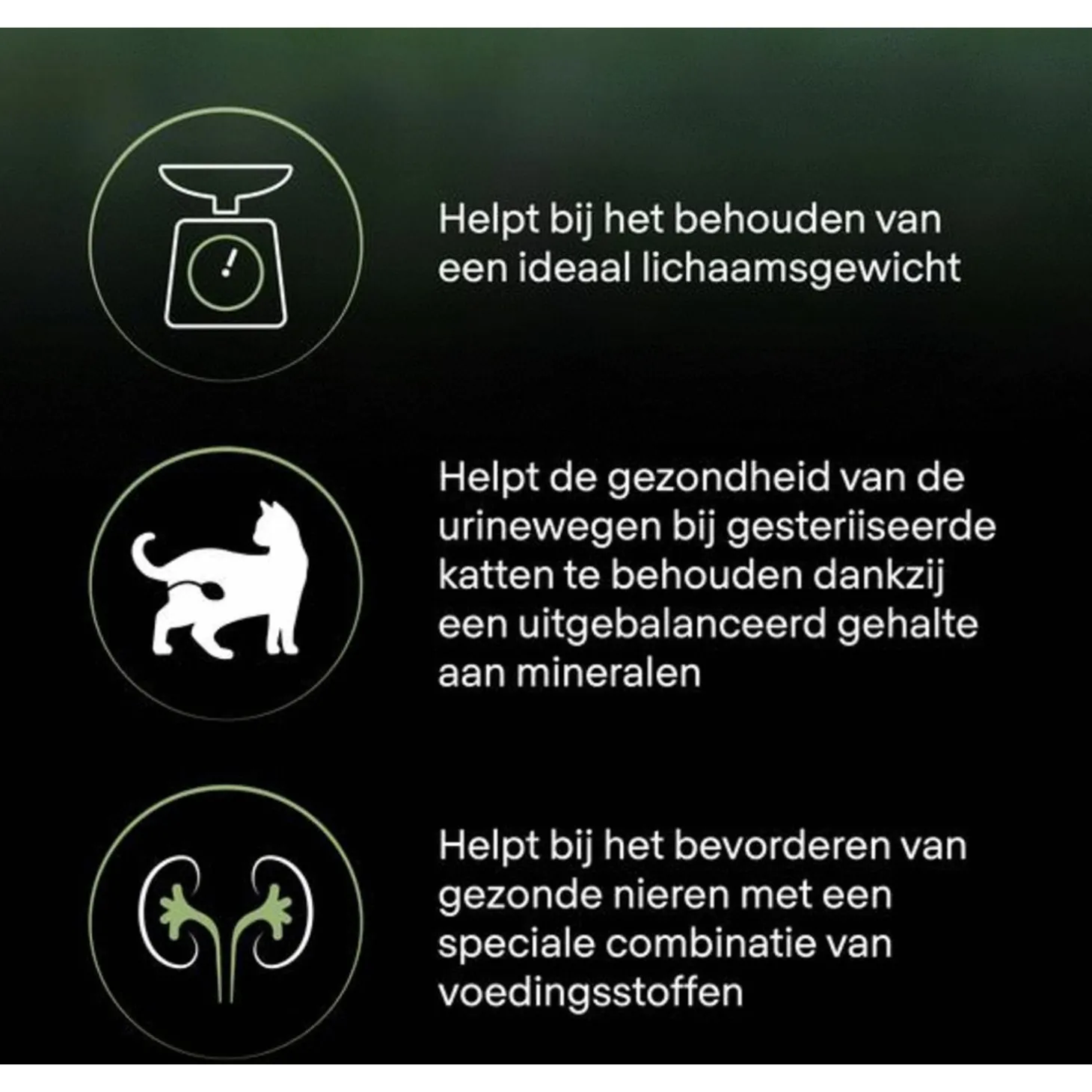 Ook de urinewegen van je gesteriliseerde of gecastreerde kat worden ondersteund met behulp van uitgebalanceerde mineralen. Als laatste zorgen toegevoegde vezels, een hoog eiwitgehalte en een laag koolhydraatgehalte voor een ideaal lichaamsgewicht.