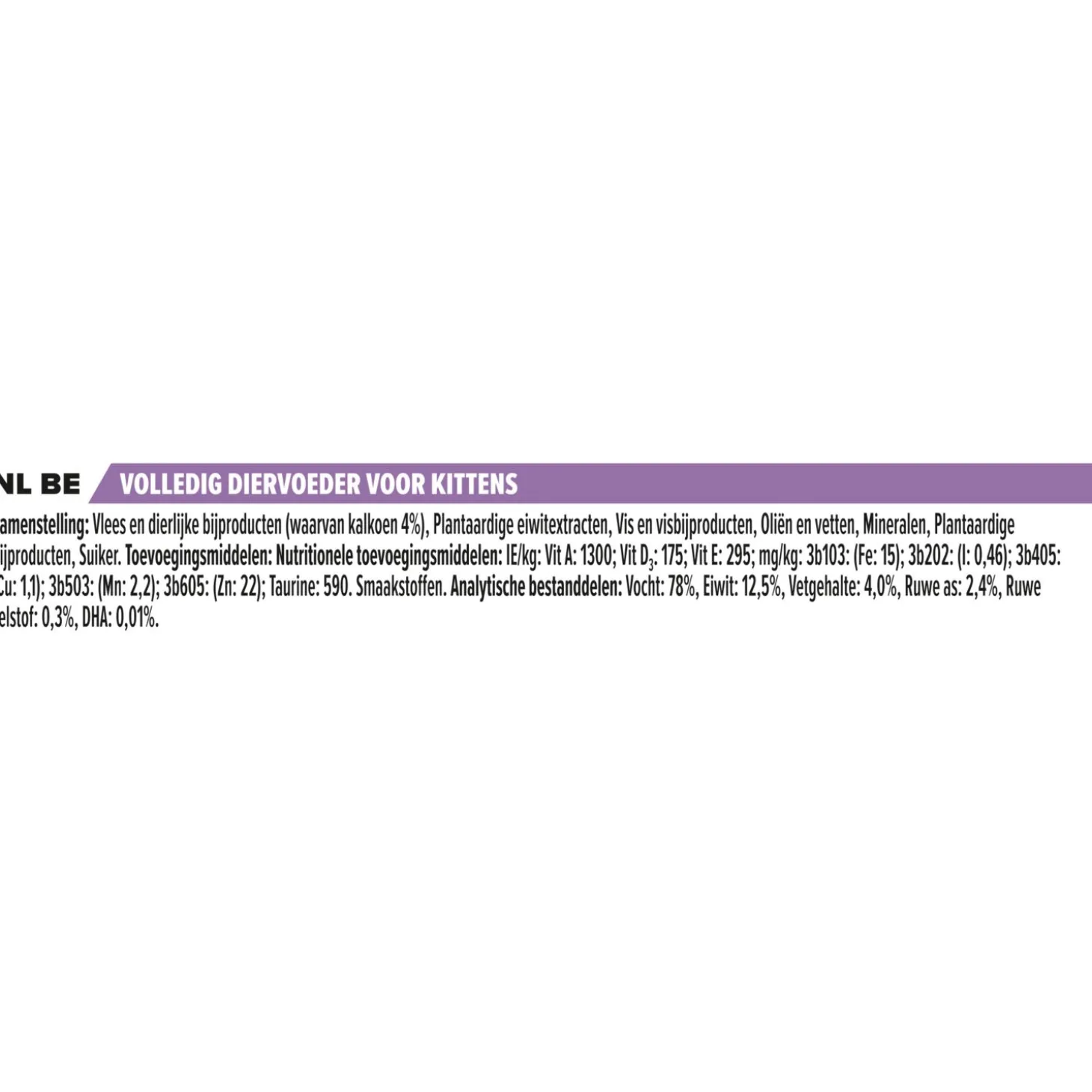 | Aanbeveling | VOEDINGSADVIES: Geef een kitten van 6-12 weken 1 tot 4 maaltijdzakjes per dag; van 12-26 weken 2 tot 5 maaltijdzakjes per dag en van 26-52 weken 5 tot 3 maaltijdzakjes per dag verdeeld over verschillende maaltijden of naar behoefte. ledere kitten is verschillend, de aanbevolen dagelijkse hoeveelheden en/of de toegestane tijd om te eten dienen te worden aangepast aan het activiteitenpatroon en de conditie van de kitten. |