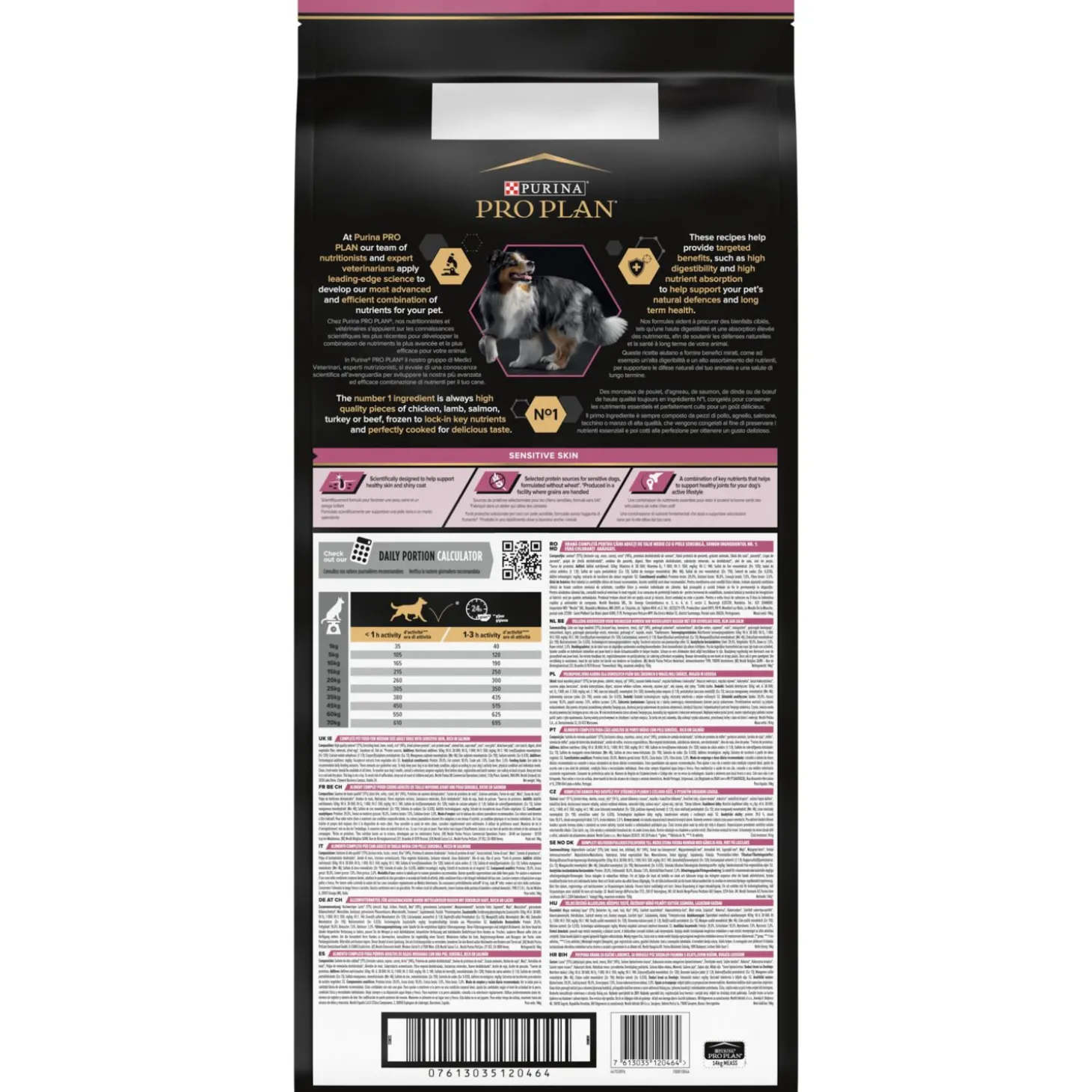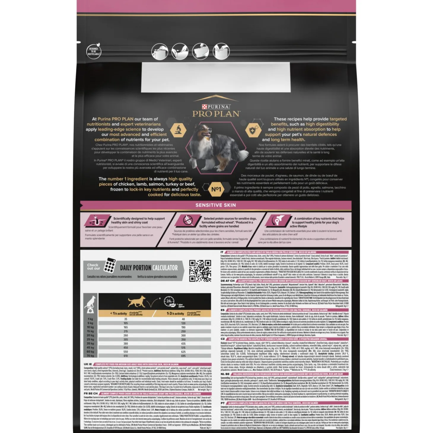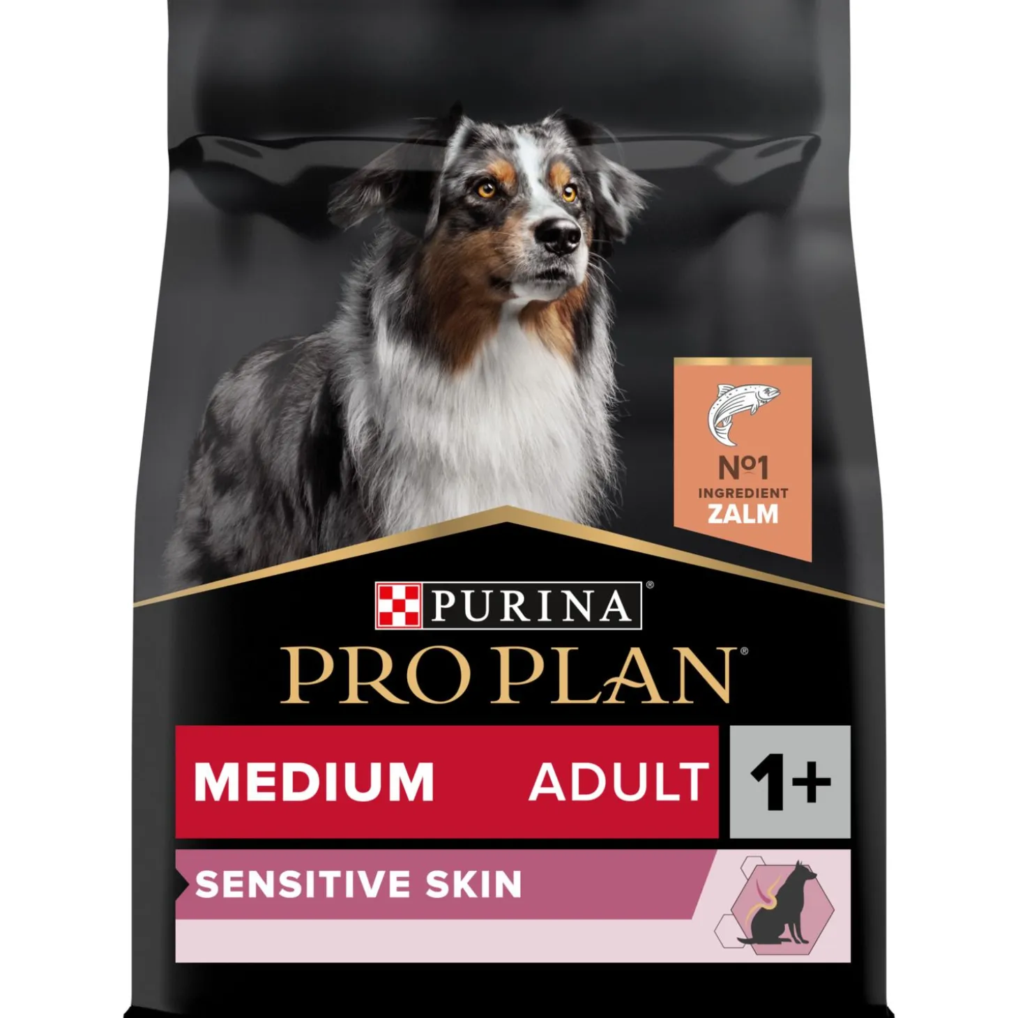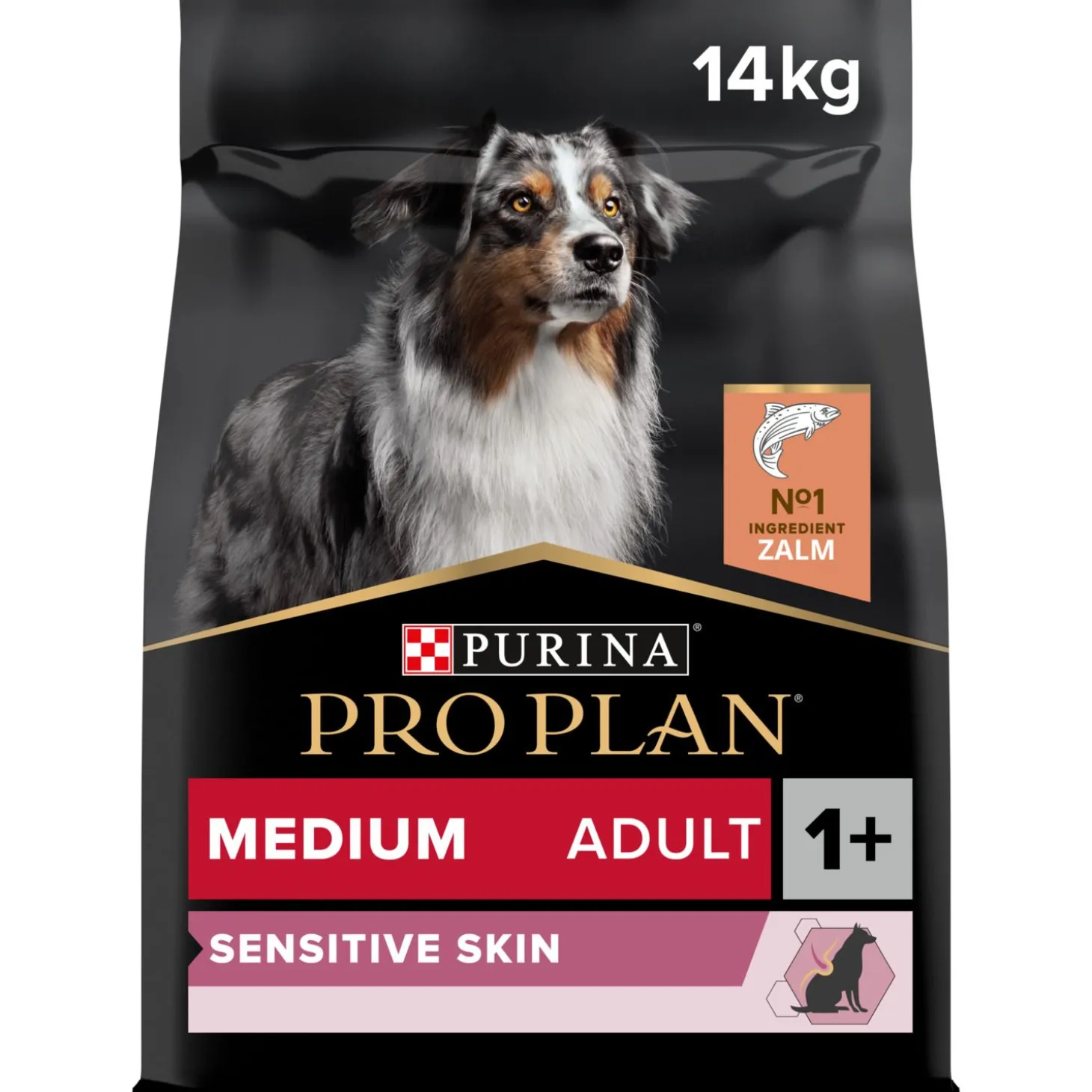 Purina Pro Plan Dog Sensitive Skin is verkrijgbaar in 3 kg en 14 kg.