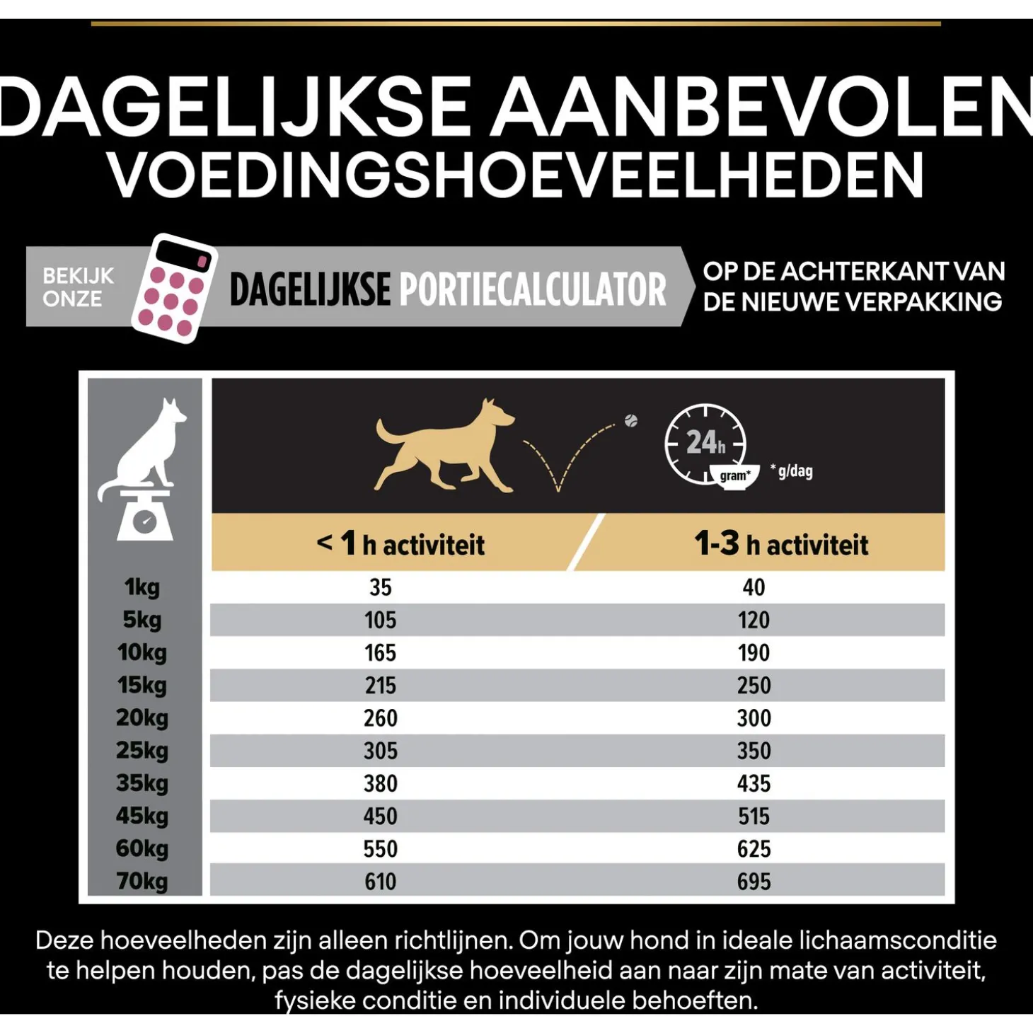 | Aanbeveling | Voedingsadvies: zie de tabel voor de dagelijkse aanbevolen voedingshoeveelheden. Deze hoeveelheden zijn alleen richtlijnen. Pas de dagelijkse hoeveelheid aan naar zijn mate van activiteit, fysieke conditie en individuele behoeften om jouw hond in ideale lichaamsconditie te helpen houden. Schoon en vers drinkwater dient altijd beschikbaar te zijn. Raadpleeg regelmatig een dierenarts voor de gezondheid van jouw hond. |