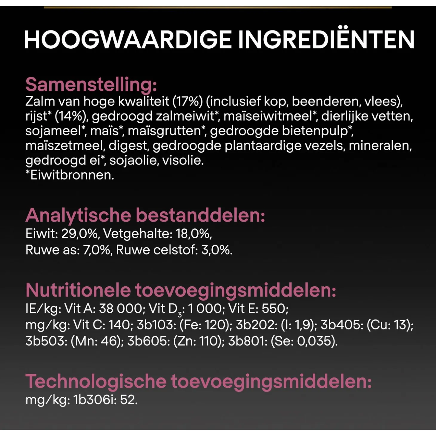 | Samenstelling | Samenstelling : Zalm van hoge kwaliteit (17%) (inclusief kop, beenderen, vlees), rijst* (14%), gedroogd zalmeiwit*, maïseiwitmeel*, dierlijke vetten, sojameel*, maïs*, maïsgrutten*, gedroogde bietenpulp*, maïszetmeel, digest, gedroogde plantaardige vezels, mineralen, gedroogd ei*, sojaolie, visolie. *Eiwitbronnen. |
