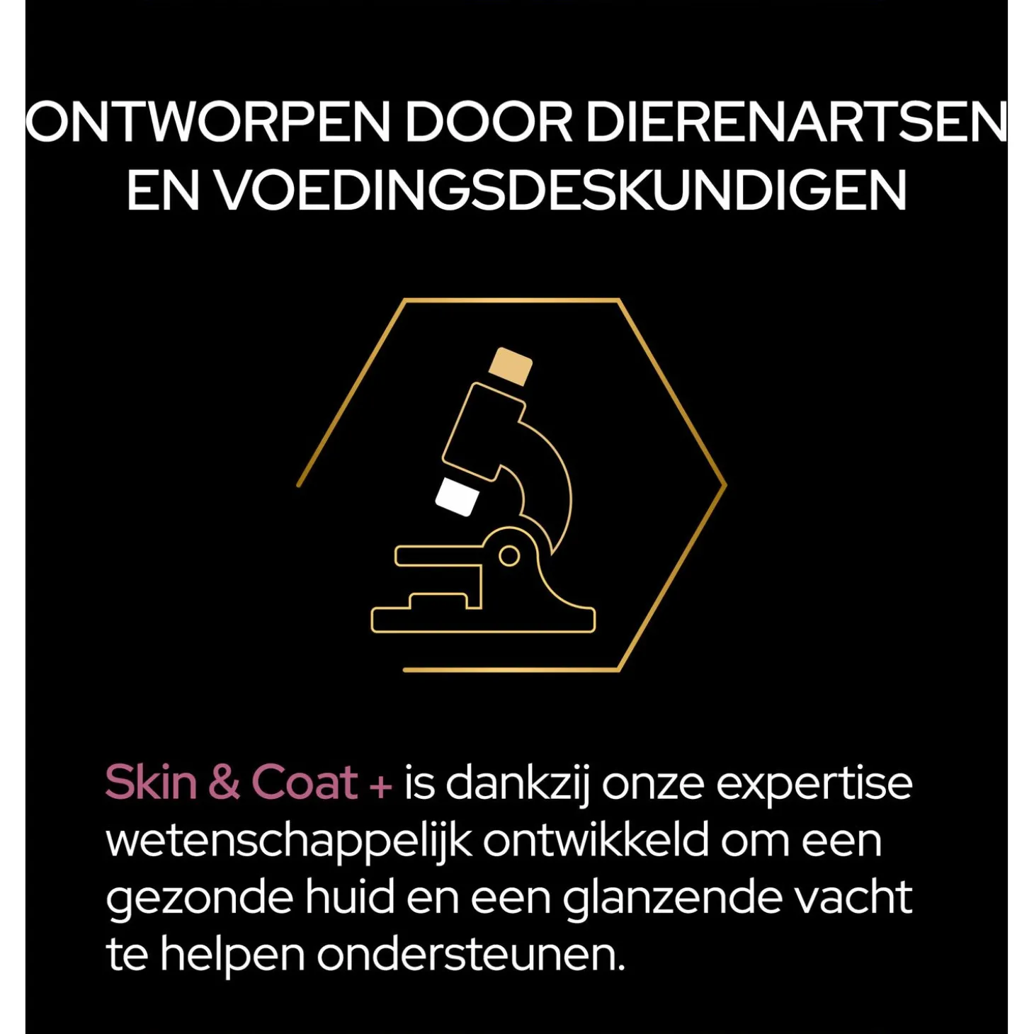 Pro Plan Skin & Coat is de ideale keuze voor zorgzame eigenaren die de huid en vacht van hun geliefde hond willen ondersteunen. Ontwikkeld door dierenartsen en voedingsdeskundigen, biedt deze wetenschappelijk ontwikkelde blend specifieke voordelen voor een gezonde huid en een glanzende, zachte vacht, dankzij hoogwaardige ingrediënten zoals Noorse zalmolie en lijnzaadolie, rijk aan Omega-3 en Omega-6, en verrijkt met vitamine E.