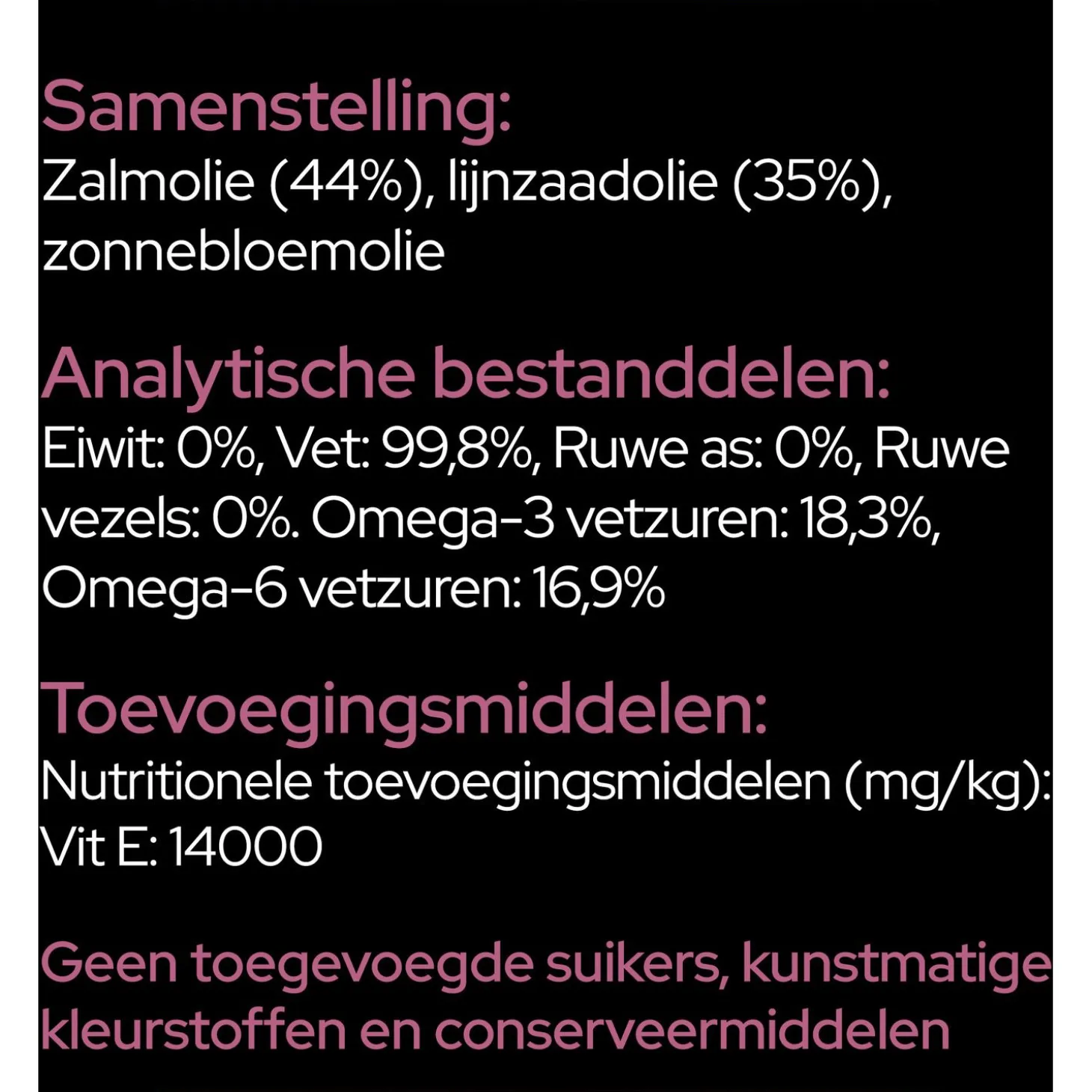 | Samenstelling | Zalmolie (44%), lijnzaadolie (35%), zonnebloemolie |