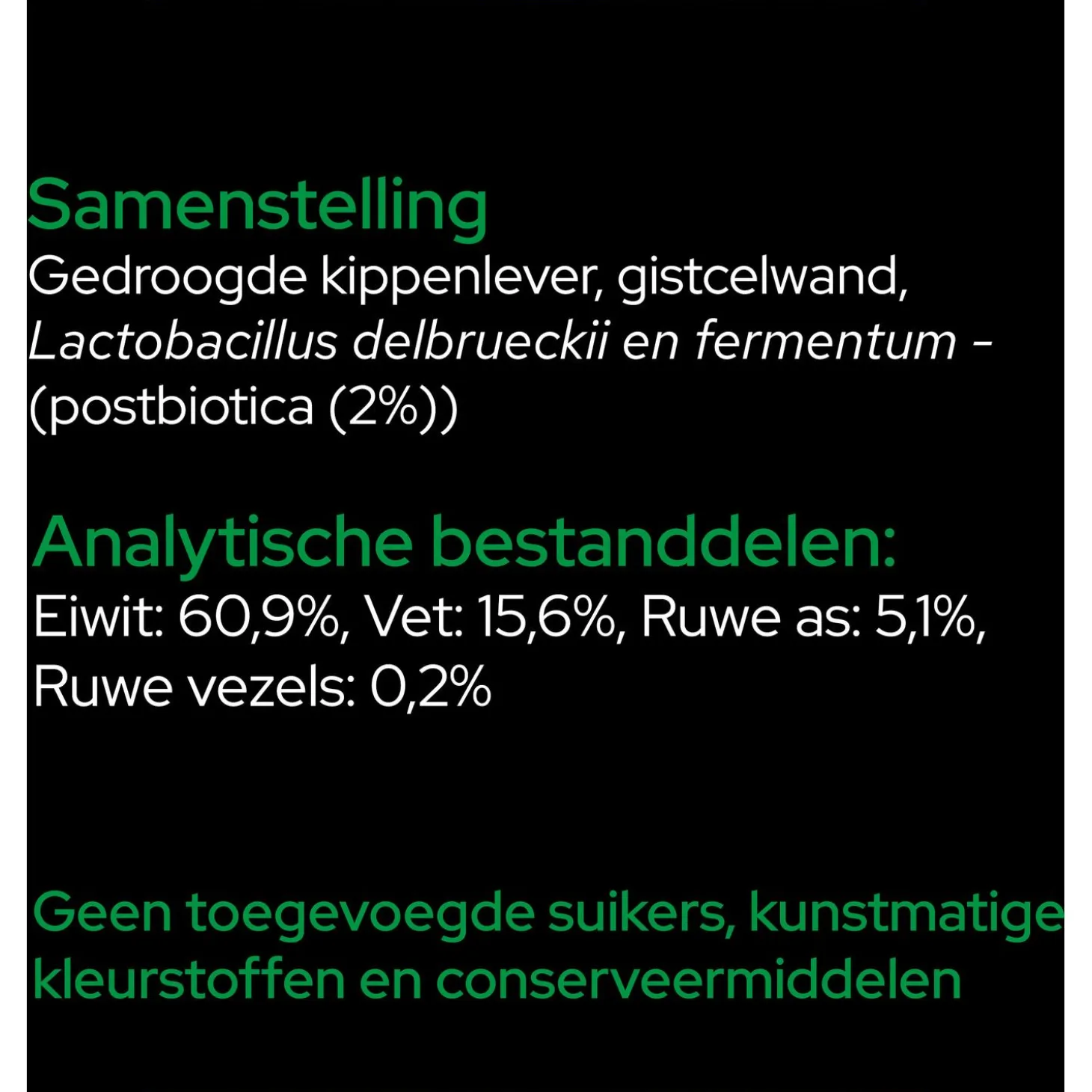 | Samenstelling | Gedroogde kippenlever, gist celwand, Lactobacillus delbrueckii en fermentum* (2%) |